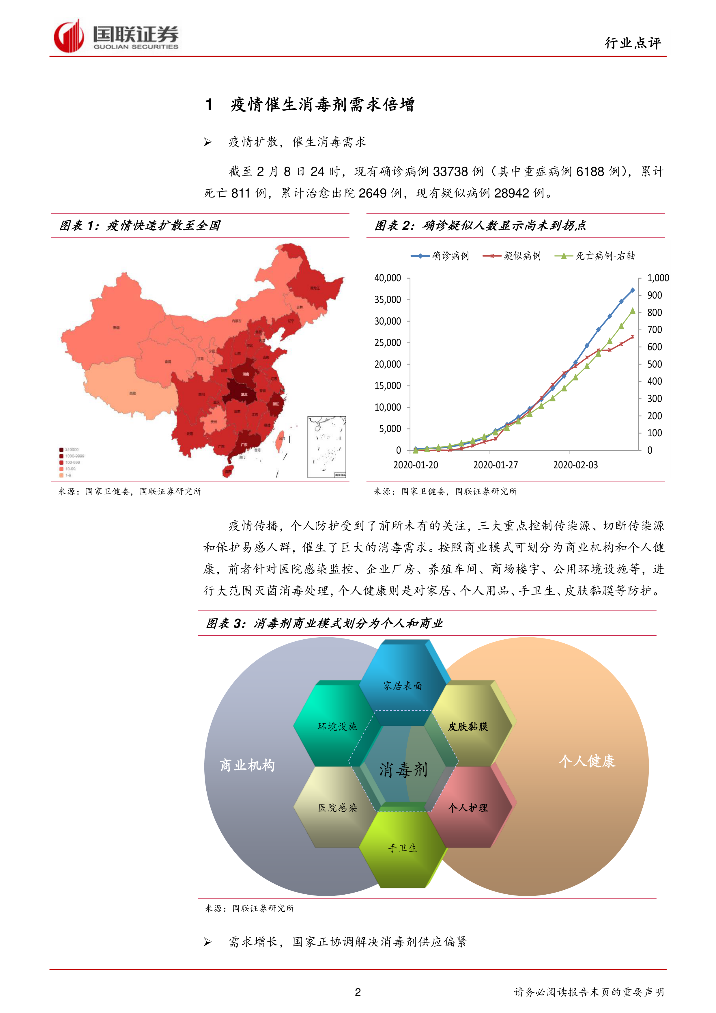 报告详细分析了新型冠状病毒疫情对消毒剂需求的影响。数据显示,疫情期间确诊和疑似病例数量持续增长,导致对消毒剂的需求激增。报告将消毒剂的商业模式划分为商业机构和个人健康两类,并分析了各自的需求特点。国家卫健委等部门也积极协调,保障消毒剂的有效供给,发布了关于部分消毒剂紧急上市的通知,以解决供应紧张的问题。