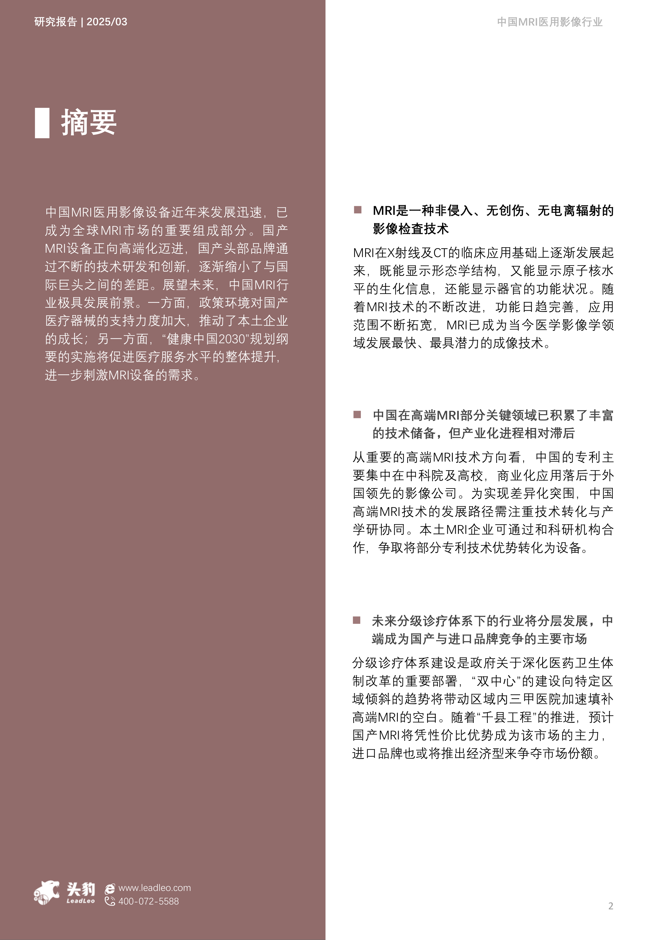 中国MRI医用影像设备近年来发展迅速, 已成为全球MRI市场的重要组成部分。 国产MRI设备正向高端化迈进, 国产头部品牌通过不断的技术研发和创新, 逐渐缩小了与国际巨头之间的差距。 展望未来, 中国MRI行业极具发展前景。 一方面, 政策环境对国产医疗器械的支持力度加大, 推动了本土企业的成长;另一方面, “健康中国2030”规划纲要的实施将促进医疗服务水平的整体提升,进一步刺激MRI设备的需求。