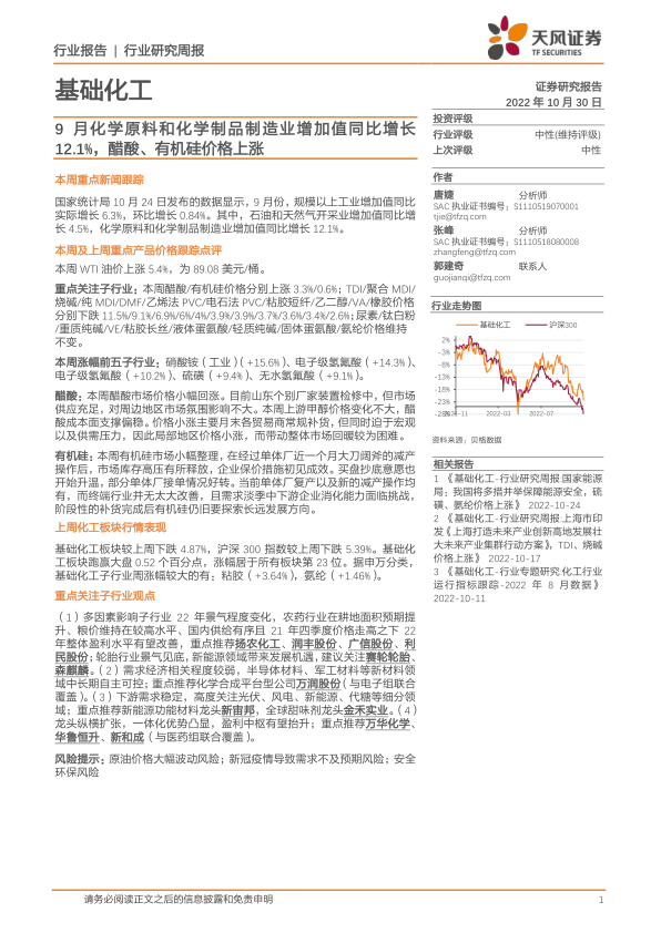 基础化工行业研究周报:9月化学原料和化学制品制造业增加值同比增长12.1%,醋酸、有机硅价格上涨