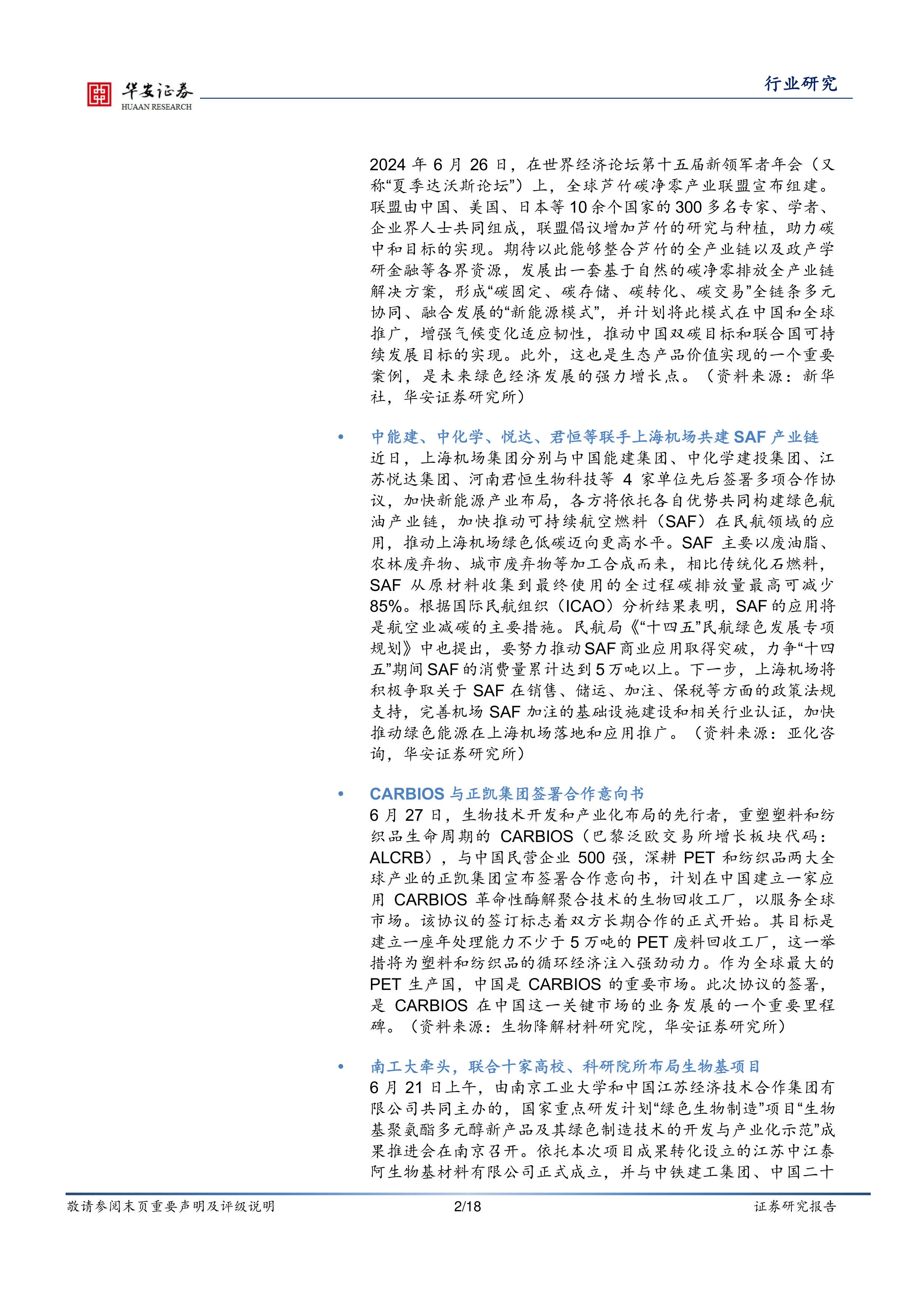 2024年6月26日,在世界经济论坛第十五届新领军者年会(又称“夏季达沃斯论坛”)上,全球芦竹碳净零产业联盟宣布组建。联盟由中国、美国、日本等10余个国家的300多名专家、学者、企业界人士共同组成,联盟倡议增加芦竹的研究与种植,助力碳中和目标的实现。期待以此能够整合芦竹的全产业链以及政产学研金融等各界资源,发展出一套基于自然的碳净零排放全产业链解决方案,形成“碳固定、碳存储、碳转化、碳交易”全链条多元协同、融合发展的“新能源模式”,并计划将此模式在中国和全球推广,增强气候变化适应韧性,推动中国双碳目标和联合国可持续发展目标的实现。此外,这也是生态产品价值实现的一个重要案例,是未来绿色经济发展的强力增长点。(资料来源:新华社,华安证券研究所)