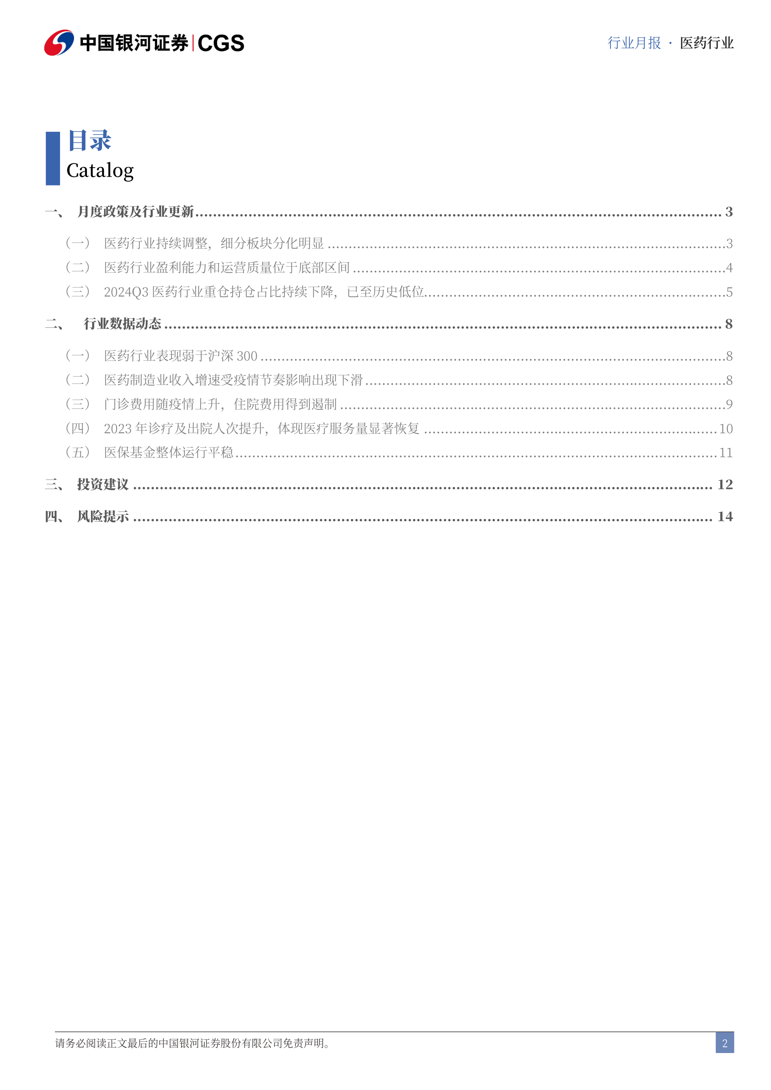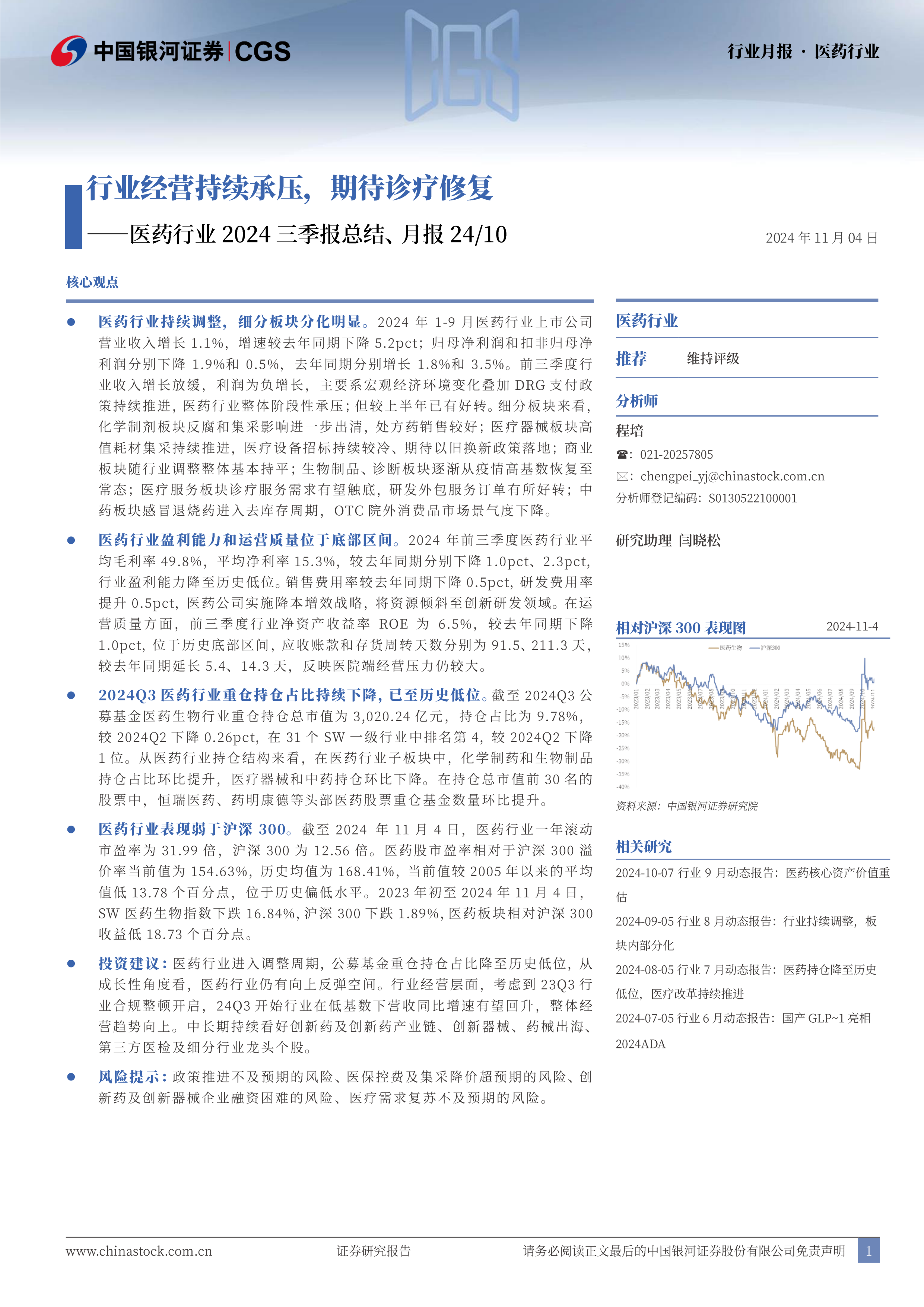 医药行业2024三季报总结、月报24/10:行业经营持续承压,期待诊疗修复
