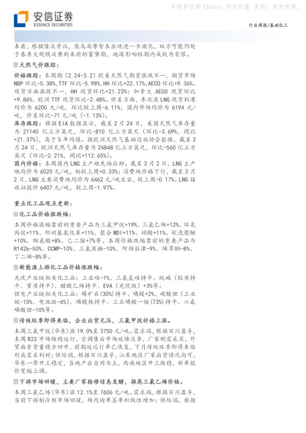 本报告的核心观点是:基础化工行业本周整体表现向好,部分产品价格上涨,主要受原料价格上涨、下游需求回暖以及供应端收紧等因素影响。但仍需关注国际油价波动、宏观经济下行风险以及地缘政治风险等因素对行业未来走势的影响。