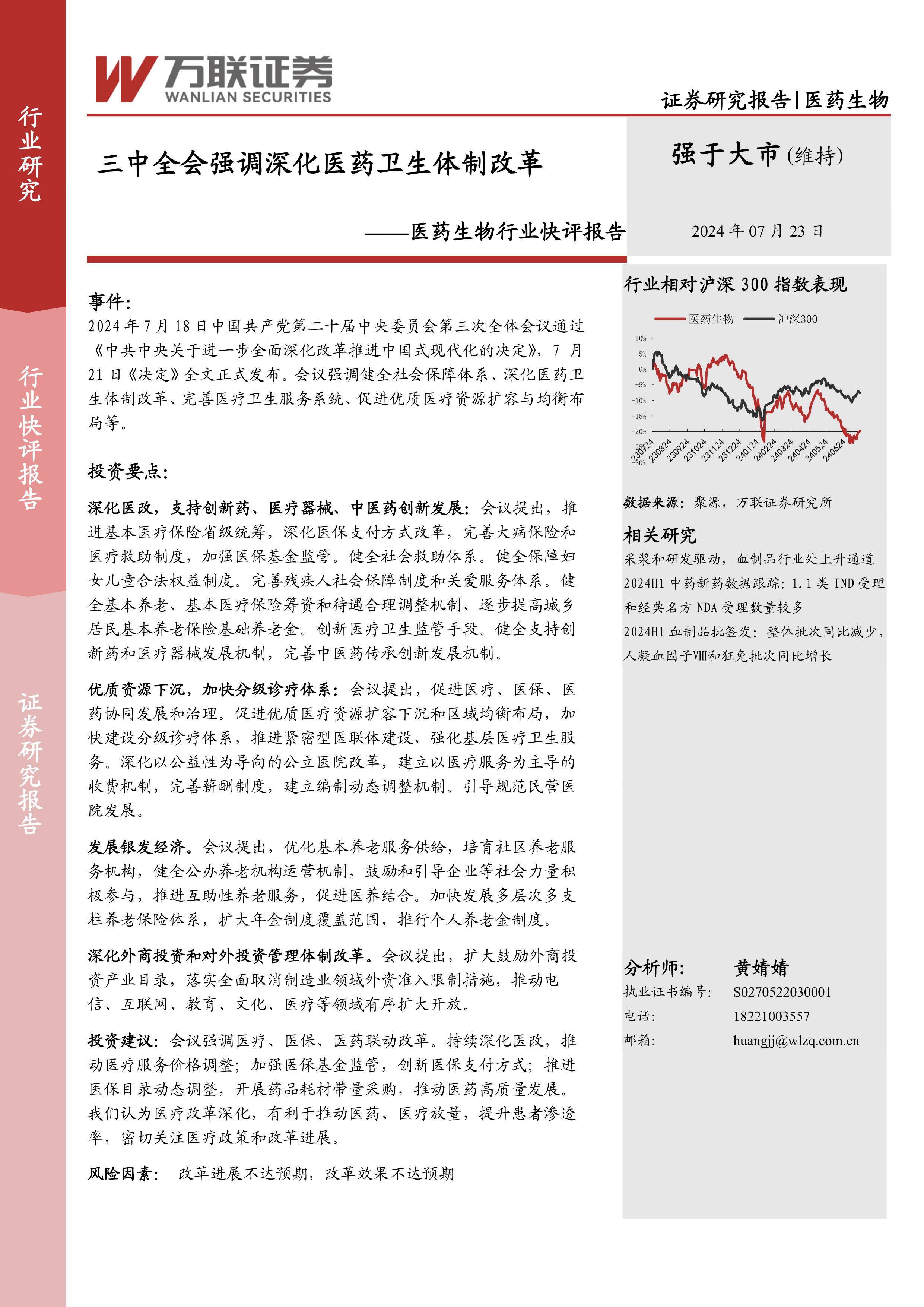 本报告是一份医药生物行业快评报告,针对三中全会关于深化医药卫生体制改革的决定进行分析。报告主要内容包括: