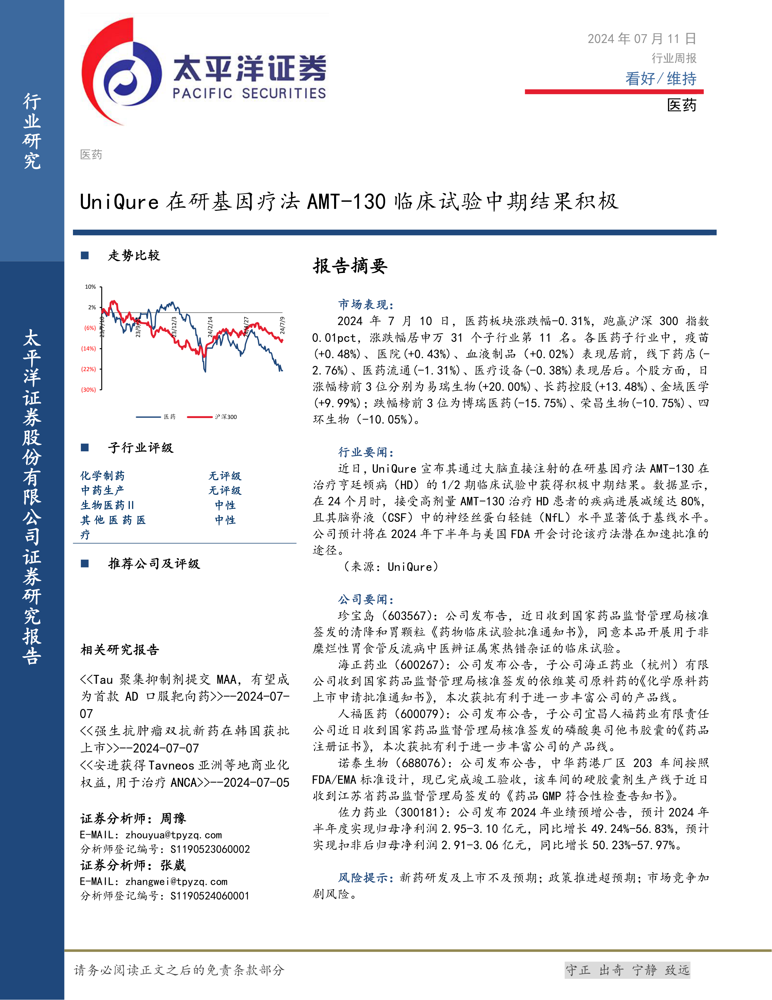 本报告的核心观点是:医药行业近期表现分化,部分细分领域表现强劲,但整体涨跌幅度有限。UniQure公司在研基因疗法AMT-130的积极中期临床试验结果为基因疗法领域带来利好,值得关注。同时,报告也指出了一些公司在研发和产品线方面的进展,以及部分公司业绩的预增情况。