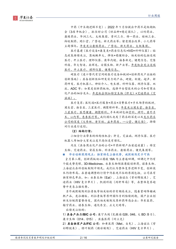 中药(中长期逻辑不变):2022年1月份提出中药不是短期机会(3-5年机会),抓住好公司(好品种+稳定团队),以岭药业、康缘药业、华润三九、太极集团、贵州三力、特一药业、桂林三金、羚锐制药、同仁堂、广誉远、新天药业等;留意国企改革、小儿药等主题催化。年度关注康缘药业、广誉远、新天药业、太极集团。