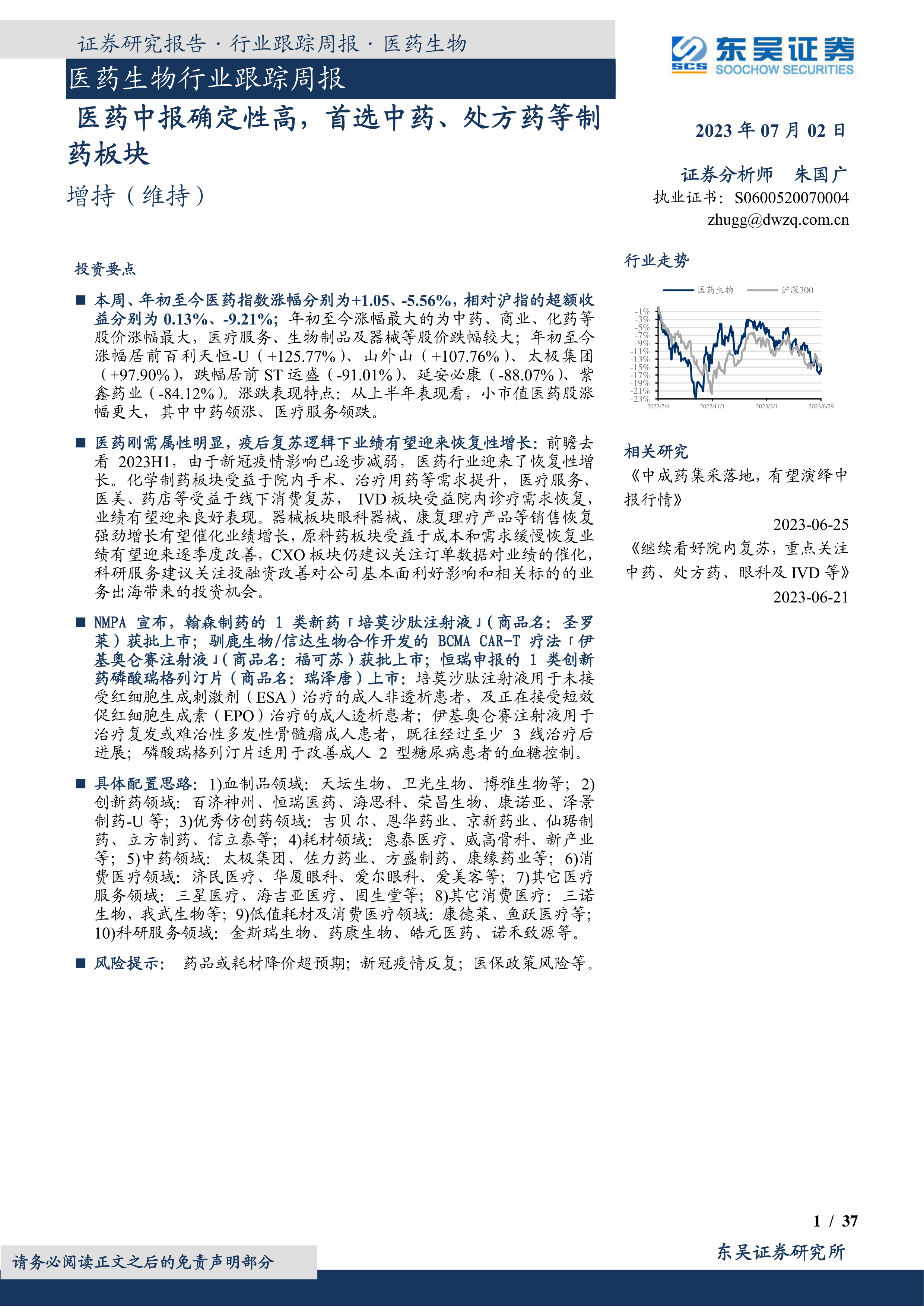 风险提示:药品或耗材降价超预期;新冠疫情反复;医保政策风险等。