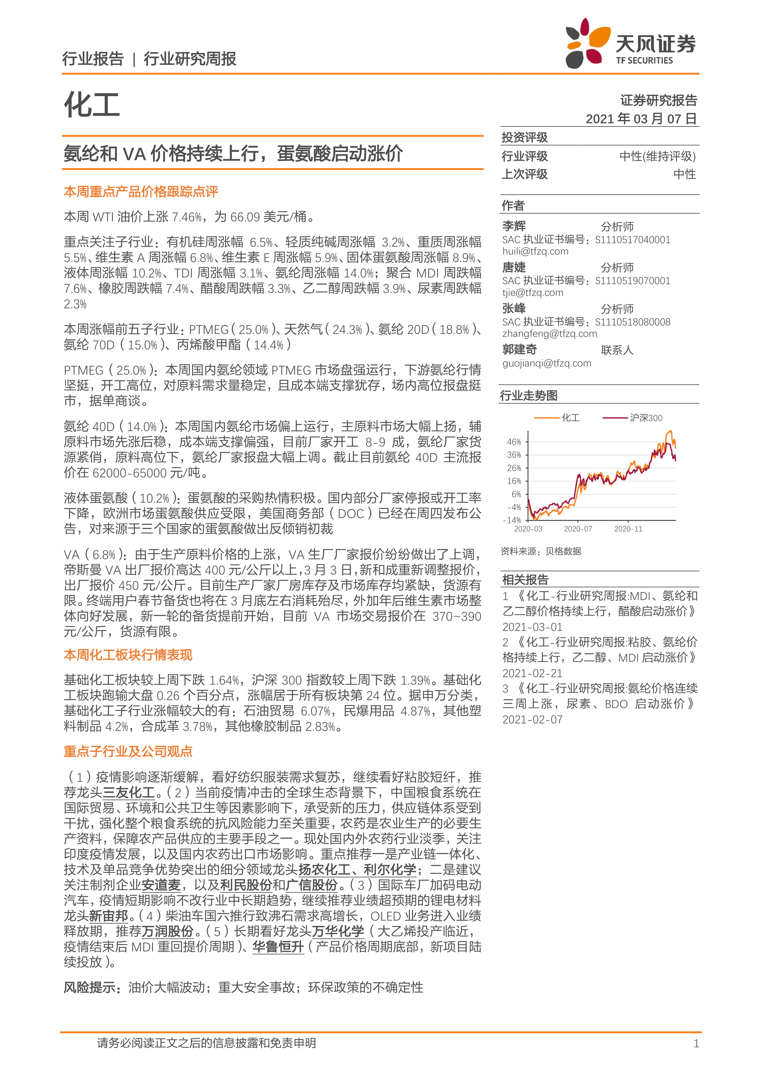 本报告的核心观点是:2021年3月7日当周,化工行业整体表现弱于大盘,但部分子行业表现强劲,价格持续上行。氨纶、VA、蛋氨酸等产品价格上涨显著,主要受原料价格上涨、供应紧张以及下游需求复苏等因素驱动。 同时,部分产品价格下跌,例如聚合MDI和橡胶,这反映了市场供需关系的复杂性。报告建议关注粘胶短纤、农药、锂电材料、沸石以及万华化学和华鲁恒升等龙头企业。