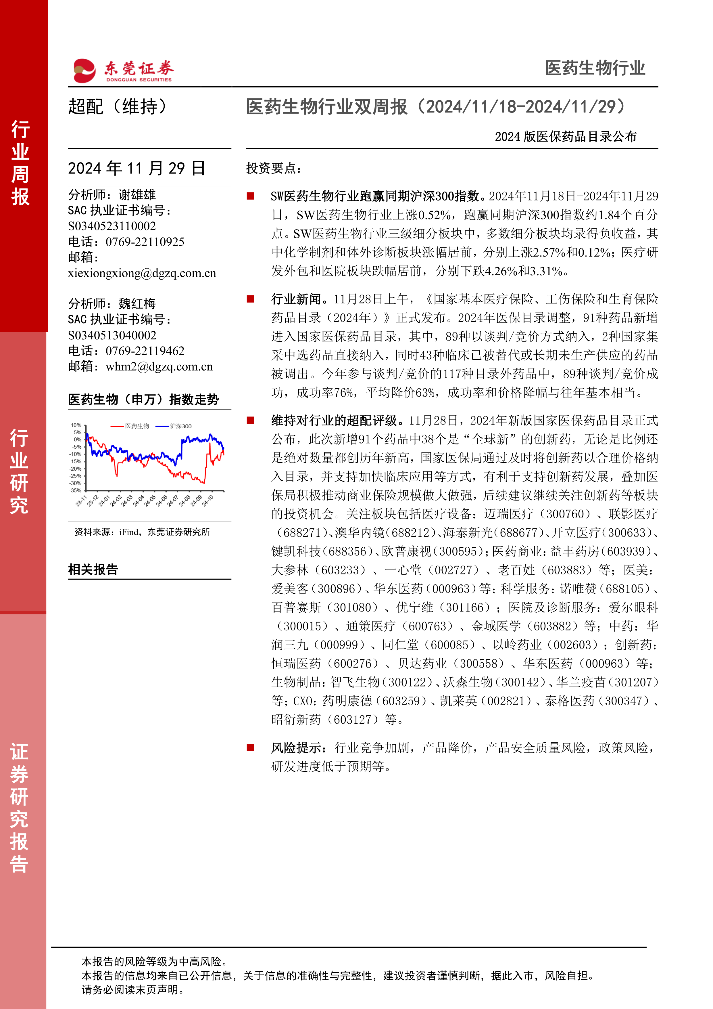 维持对行业的超配评级。11月28日,2024年新版国家医保药品目录正式公布,此次新增91个药品中38个是“全球新”的创新药,无论是比例还是绝对数量都创历年新高,国家医保局通过及时将创新药以合理价格纳入目录,并支持加快临床应用等方式,有利于支持创新药发展,叠加医保局积极推动商业保险规模做大做强,后续建议继续关注创新药等板块的投资机会。关注板块包括医疗设备:迈瑞医疗(300760)、联影医疗(688271)、澳华内镜(688212)、海泰新光(688677)、开立医疗(300633)键凯科技(688356)、欧普康视(300595);医药商业:益丰药房(603939)大参林(603233)、一心堂(002727)、老百姓(603883)等;医美:爱美客(300896)、华东医药(000963)等;科学服务:诺唯赞(688105)百普赛斯(301080)、优宁维(301166);医院及诊断服务:爱尔眼科(300015)、通策医疗(600763)、金域医学(603882)等;中药:华润三九(000999)、同仁堂(600085)、以岭药业(002603);创新药:恒瑞医药(600276)、贝达药业(300558)、华东医药(000963)等;生物制品:智飞生物(300122)、沃森生物(300142)、华兰疫苗(301207)等;CXO:药明康德(603259)、凯莱英(002821)、泰格医药(300347)昭衍新药(603127)等。