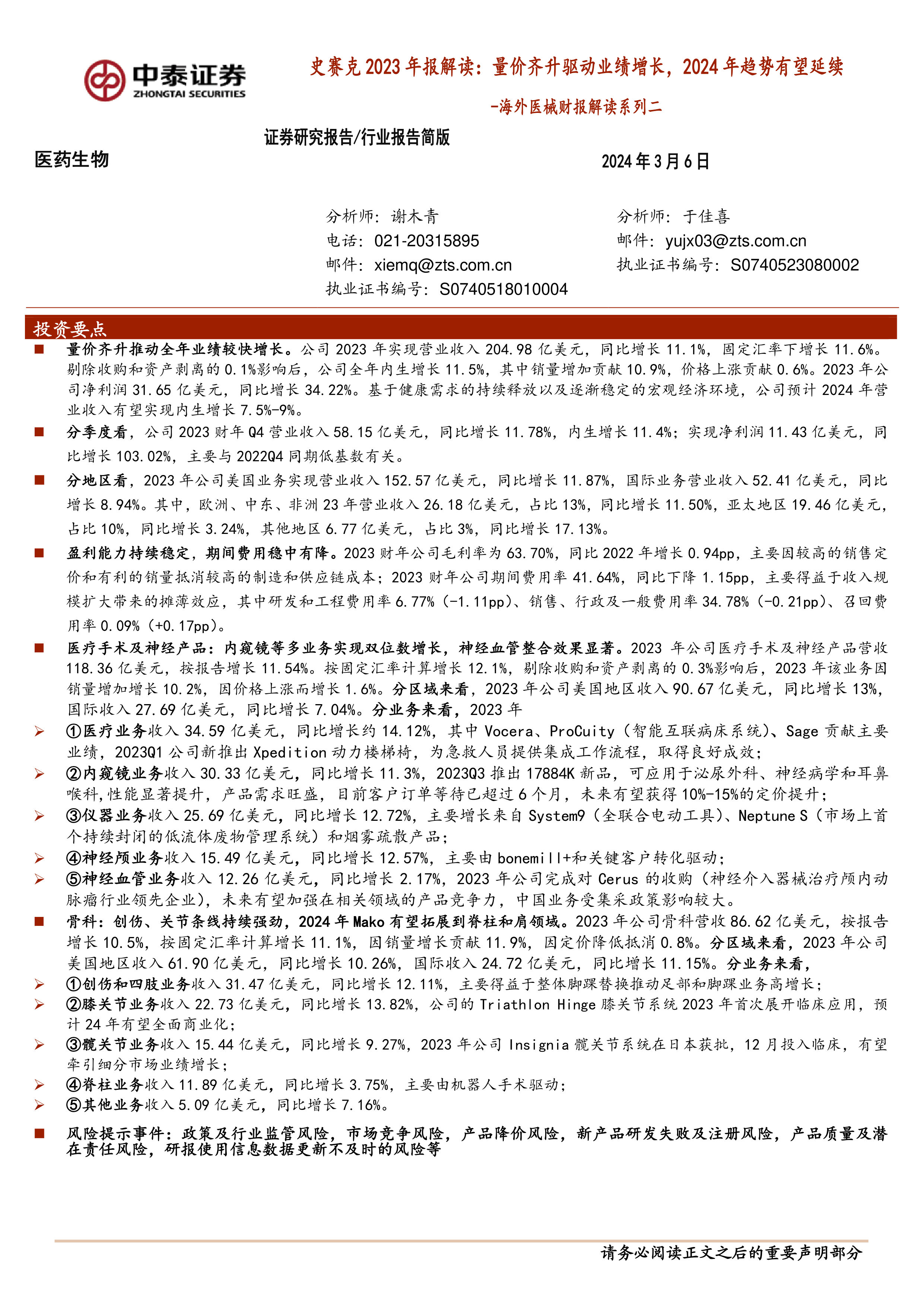 海外医械财报解读系列二:史赛克2023年报解读:量价齐升驱动业绩增长,2024年趋势有望延续