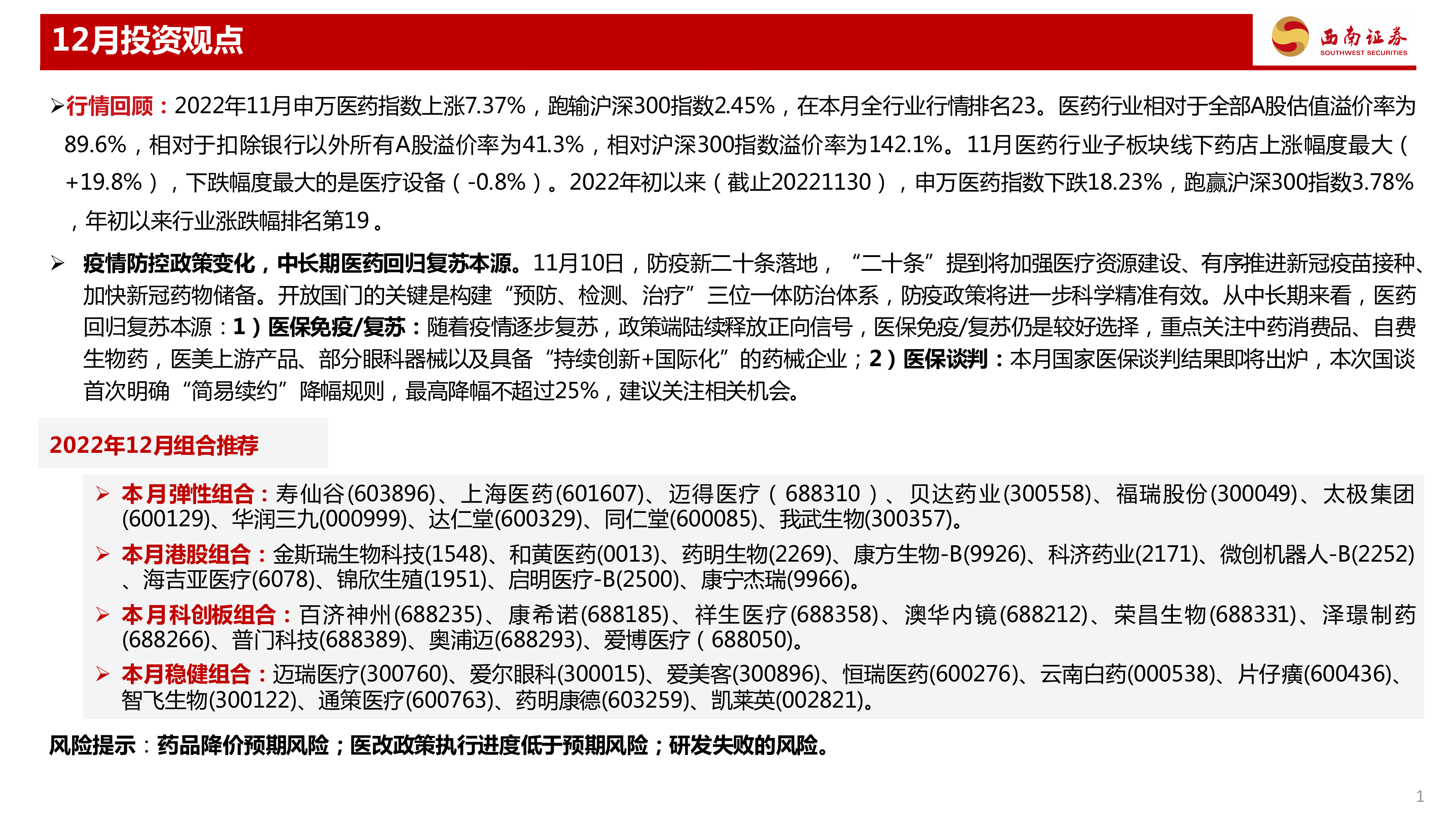 报告根据市场分析和政策解读,提出了2022年12月的投资组合推荐,包括弹性组合、港股组合、科创板组合和稳健组合,并对组合中部分重点公司进行了深入分析,例如上海医药、迈得医疗、寿仙谷、贝达药业、福瑞股份、太极集团、华润三九、达仁堂、同仁堂、我武生物等。 分析内容涵盖了公司三季报业绩、未来发展战略、以及面临的风险等方面。