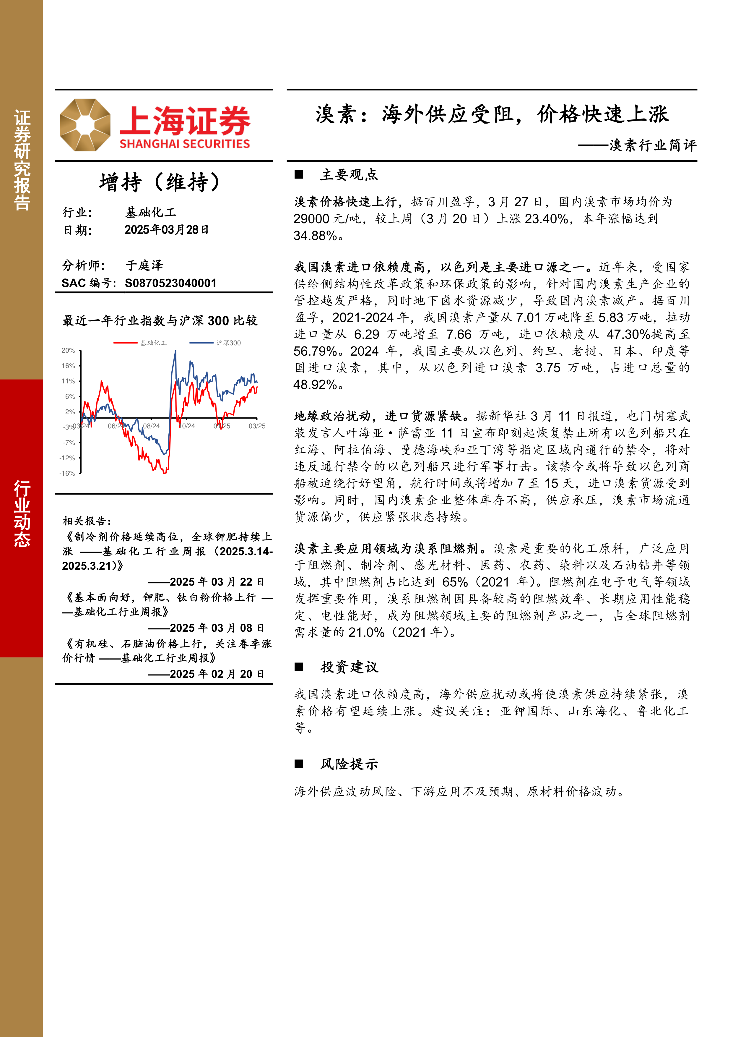 鉴于我国溴素进口依赖度高,海外供应扰动或将使溴素供应持续紧张,溴素价格有望延续上涨趋势。建议关注相关上市公司,例如亚钾国际、山东海化、鲁北化工等。 (注意: 此投资建议仅供参考,不构成投资建议,投资者需自行承担投资风险。)