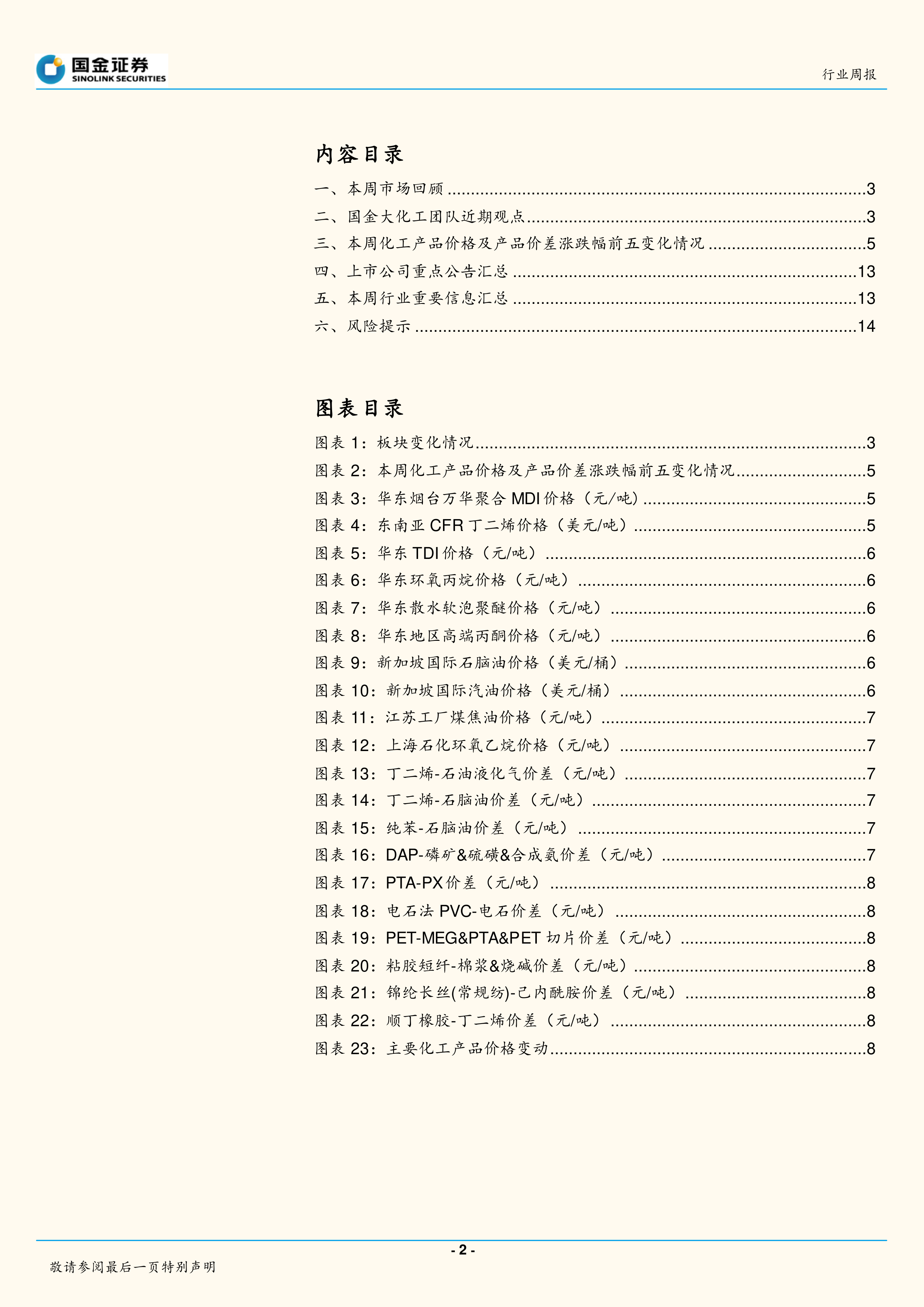 本节以图表形式展示了本周化工产品价格及产品价差涨跌幅前五的变化情况,包括聚合MDI、丁二烯、TDI等价格上涨的产品,以及丙酮、国际石脑油等价格下跌的产品,以及相应的价差变化。