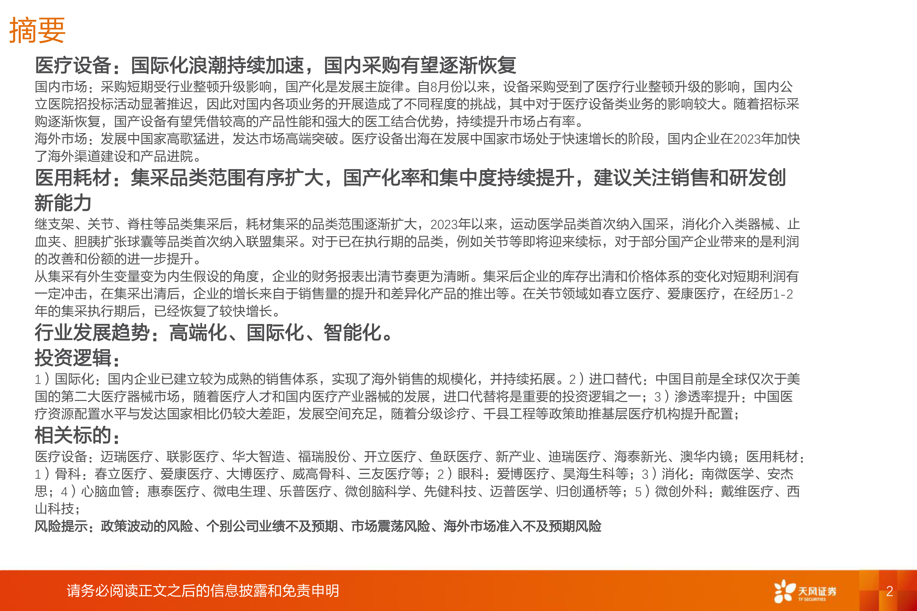 报告列出了多家医疗器械及医用耗材相关上市公司,涵盖医疗设备、骨科、眼科、消化、心脑血管、微创外科等多个领域。 同时,报告也指出了政策波动、公司业绩不及预期、市场震荡以及海外市场准入不及预期等风险。