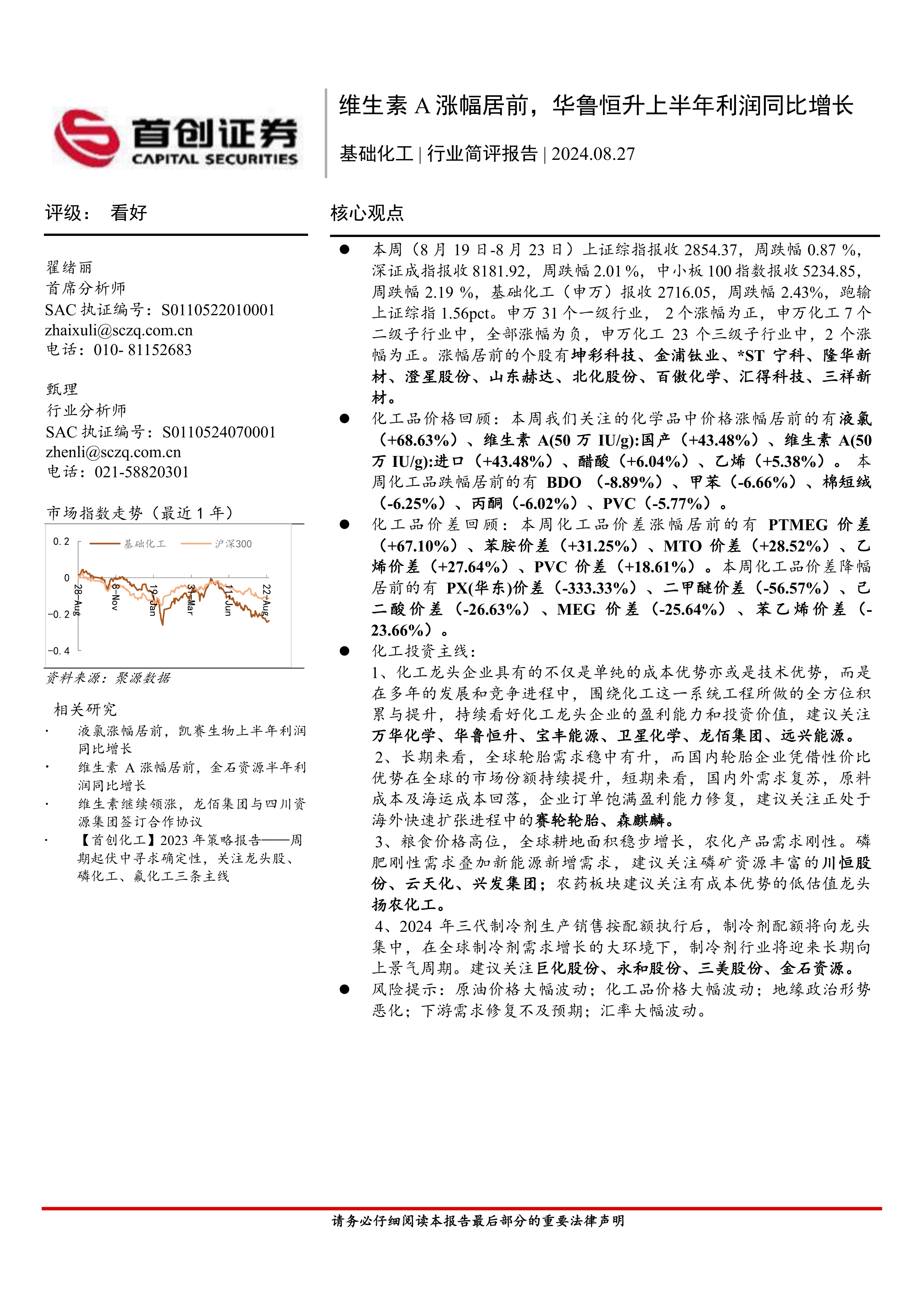 基础化工行业简评报告:维生素A涨幅居前,华鲁恒升上半年利润同比增长