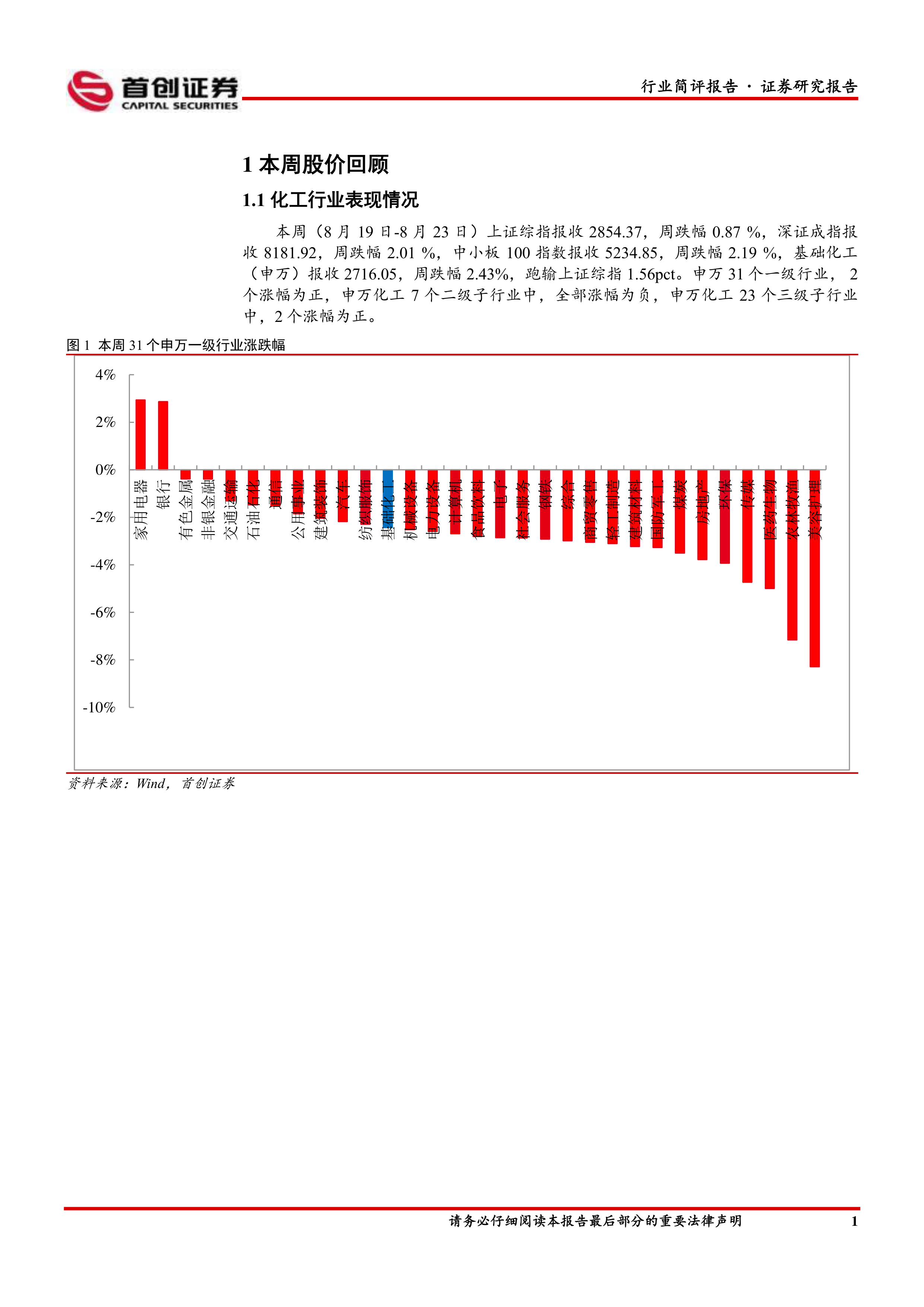 本周(8月19日-8月23日)上证综指报收2854.37,周跌幅0.87%,深证成指报收8181.92,周跌幅2.01%,中小板100指数报收5234.85,周跌幅2.19%,基础化工(申万)报收2716.05,周跌幅2.43%,跑输上证综指1.56pct。申万31个一级行业,2个涨幅为正,申万化工7个二级子行业中,全部涨幅为负,申万化工23个三级子行业中,2个涨幅为正。涨幅居前的个股有坤彩科技、金浦钛业、*ST宁科、隆华新材、澄星股份、山东赫达、北化股份、百傲化学、汇得科技、三祥新材。