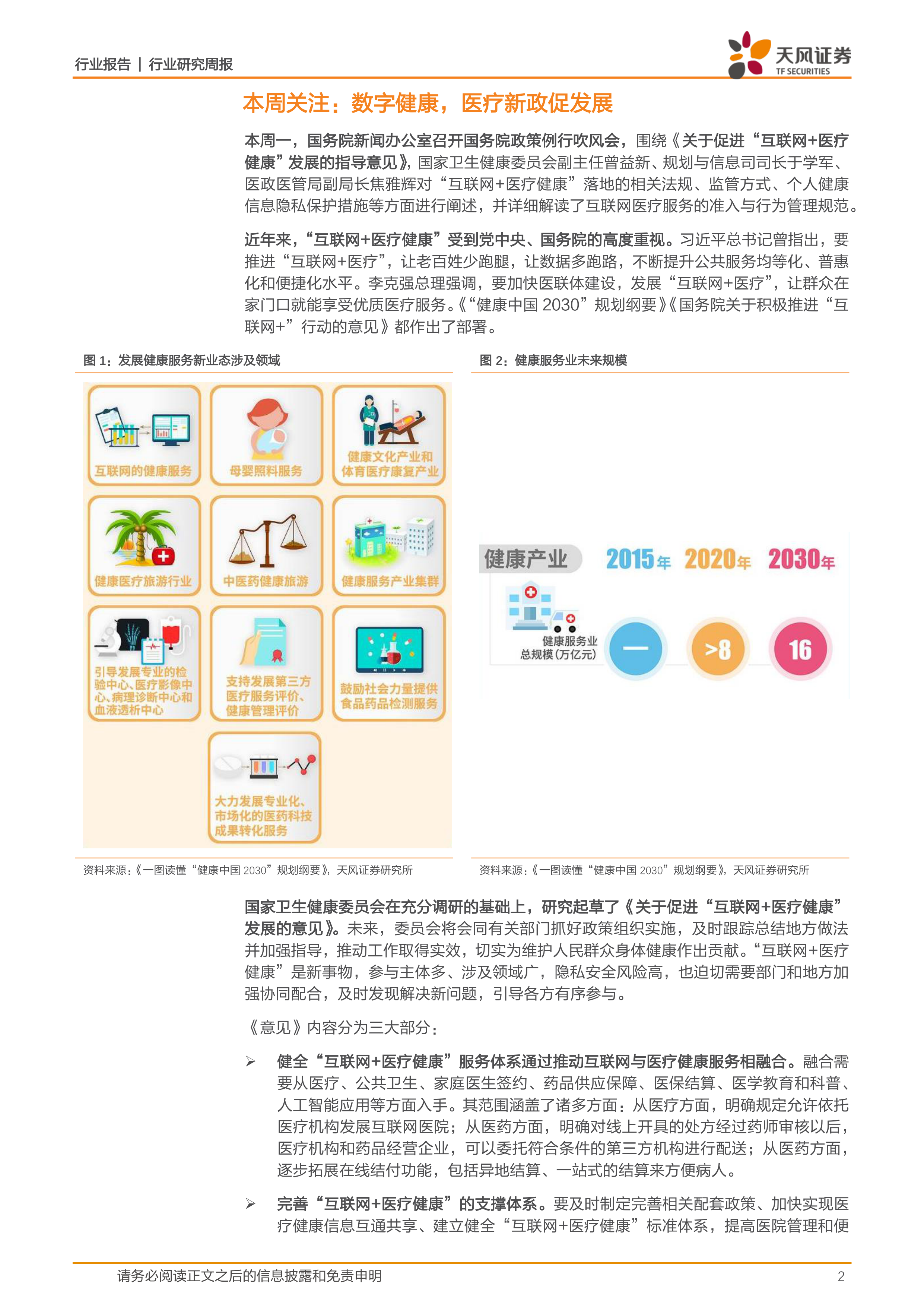 本报告分析了国务院发布的《关于促进“互联网+医疗健康”发展的指导意见》对数字健康行业的影响,并对本周数字经济领域的重大事件进行了总结。 该意见的出台为数字健康行业带来了重大利好,而中国在5G等数字技术领域的领先地位以及数字经济在各行各业的蓬勃发展,都为相关企业提供了广阔的发展空间。 报告最后推荐了三个数字经济领域的投资标的,为投资者提供了参考。 然而,投资者仍需注意政策风险和发展不及预期风险。