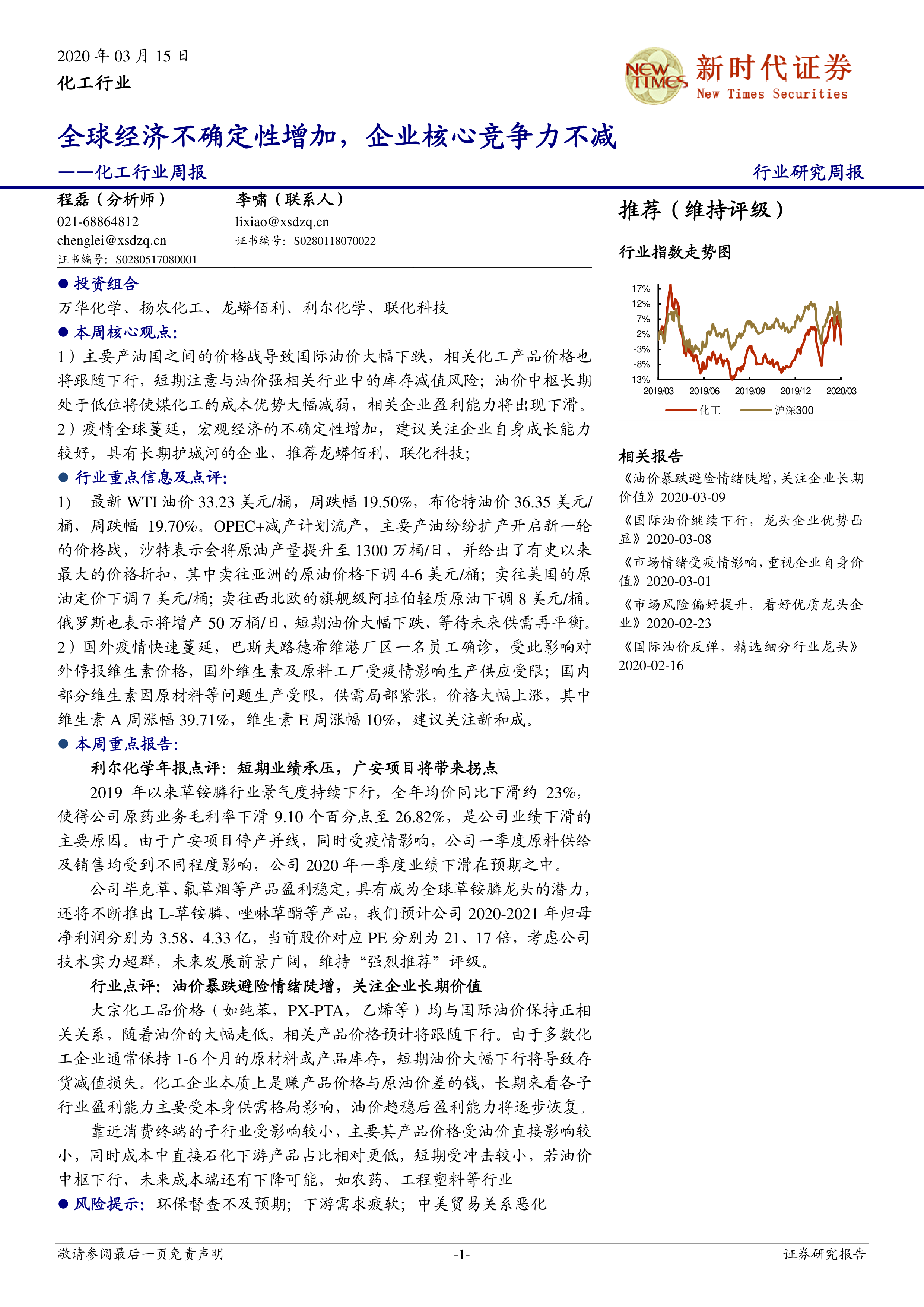 本部分详细分析了利尔化学2019年年报和一季度业绩预告,指出草铵膦行业景气度下行和广安项目延后是导致公司业绩下滑的主要原因。同时,报告也展望了公司未来发展前景,并维持“强烈推荐”评级。此外,报告还对油价暴跌对化工行业长期价值的影响进行了分析,建议关注企业自身成长能力,并推荐了龙蟒佰利和联化科技等优质企业。