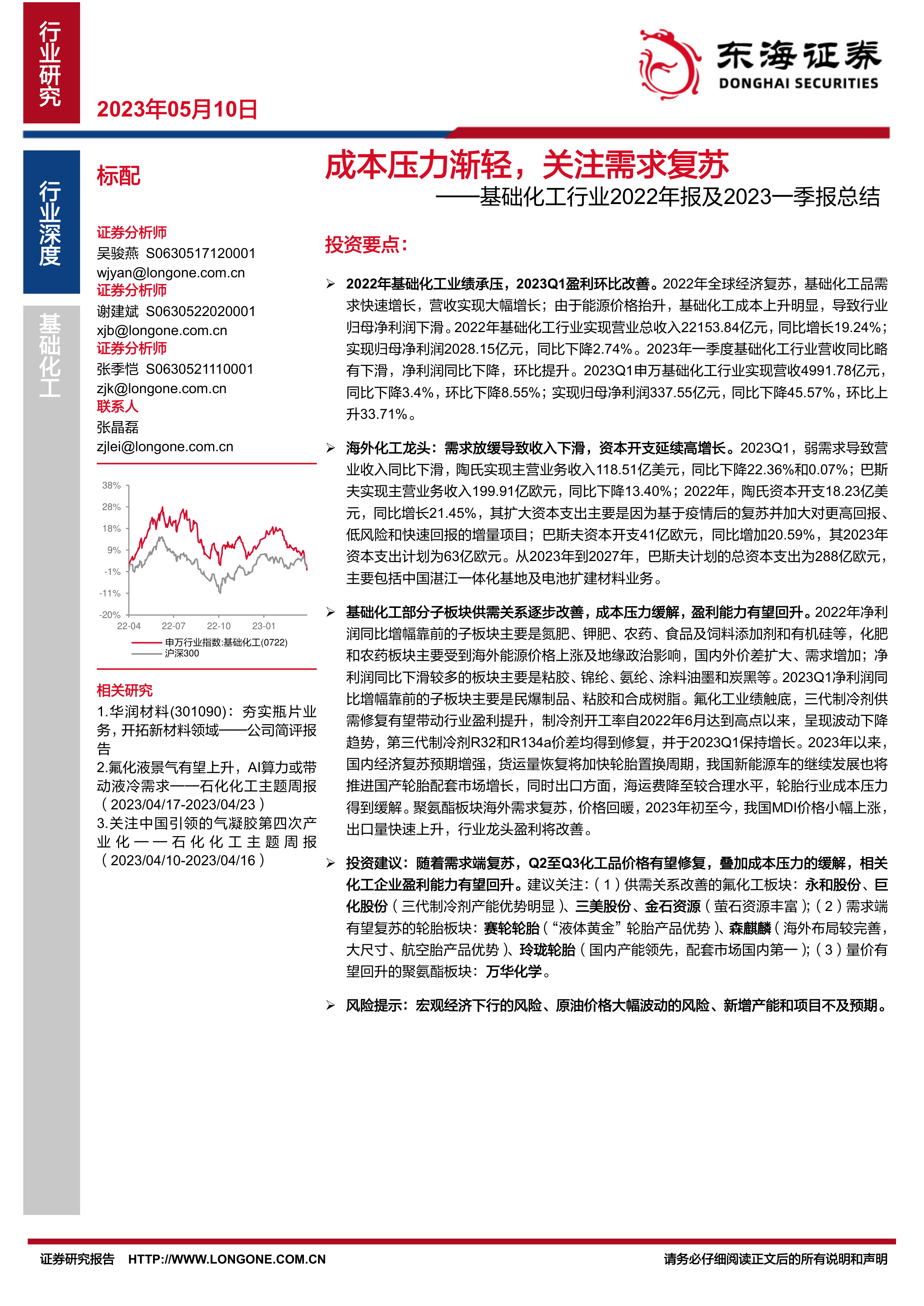 基础化工行业2022年报及2023一季报总结:成本压力渐轻,关注需求复苏