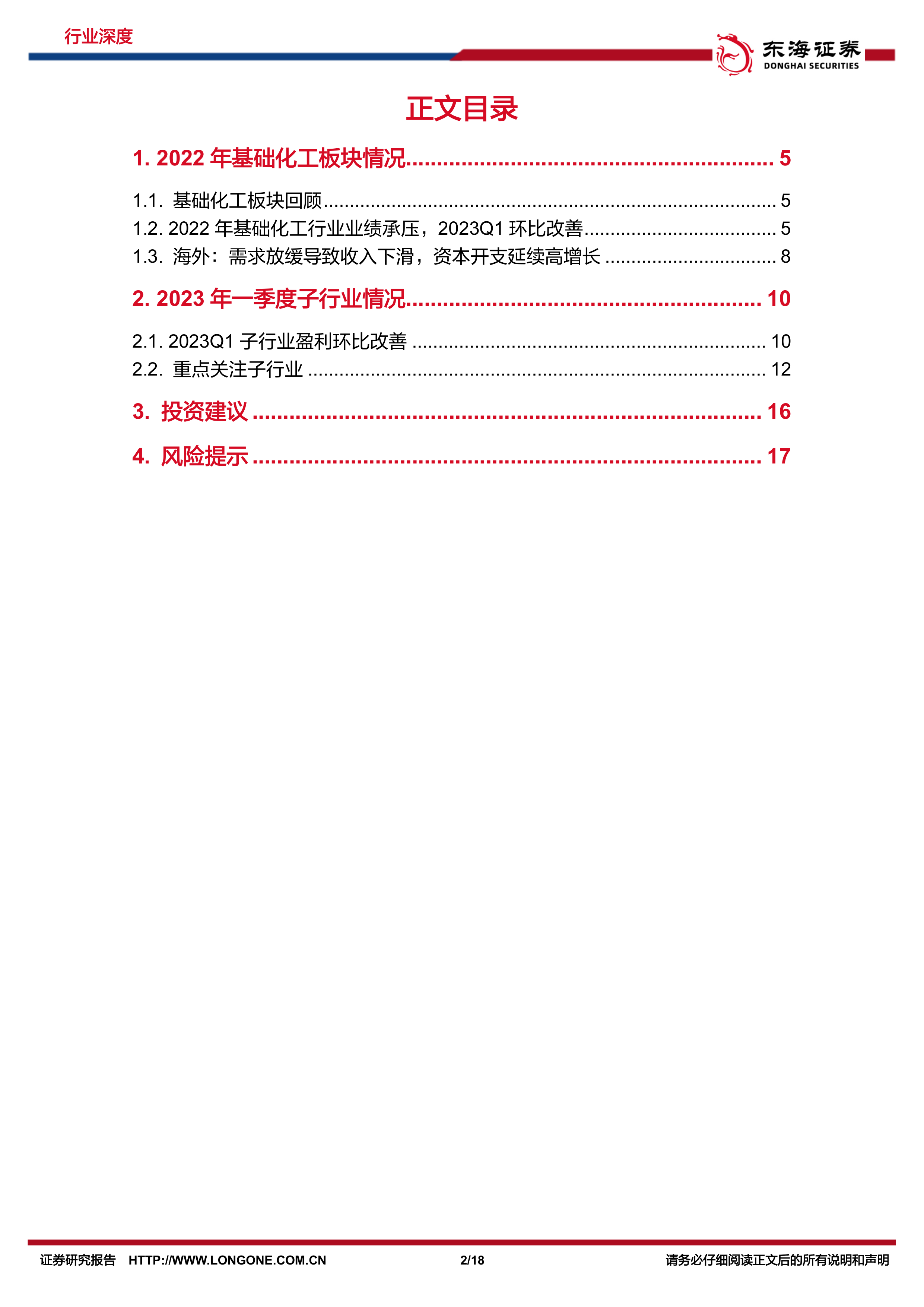 本报告的核心观点是:2022年基础化工行业在全球经济复苏的大背景下,营收大幅增长,但由于能源价格上涨导致成本上升,归母净利润下滑。2023年一季度,行业营收同比下降,净利润同比下降但环比改善。部分子板块供需关系逐步改善,成本压力缓解,盈利能力有望回升。未来建议关注供需关系改善的氟化工板块、需求端有望复苏的轮胎板块以及量价有望回升的聚氨酯板块。