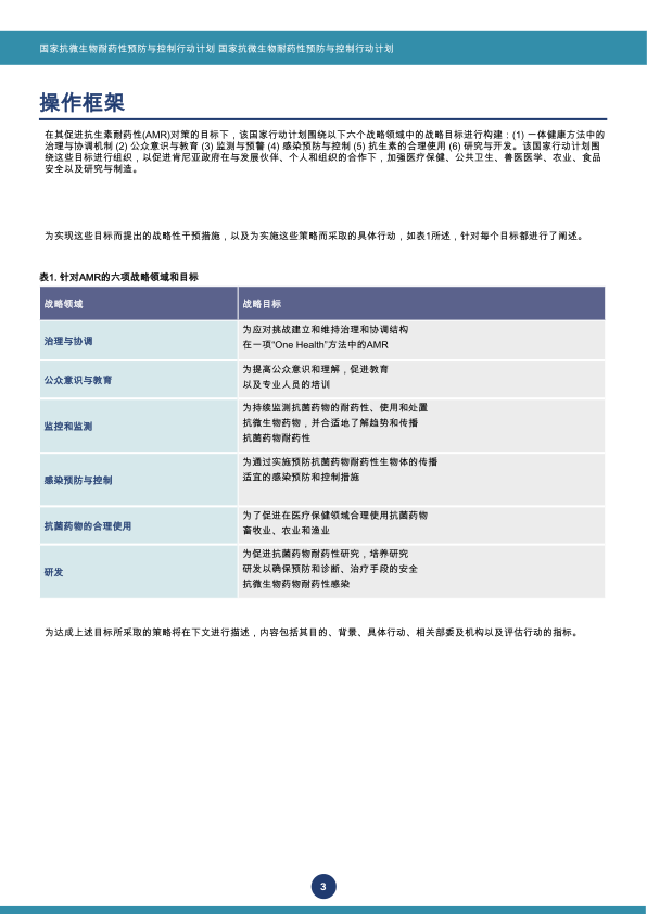 该计划详细阐述了其实施框架,包括政府承诺、国家和县级政府协调机制以及合作伙伴关系。国家层面,NASIC及其指导委员会和技术委员会负责政策制定、资源动员和技术监督;县级层面,CASIC负责县级NAP的实施。 此外,计划还设立了国家AMR联络人和AMR技术工作组,以加强协调和合作。