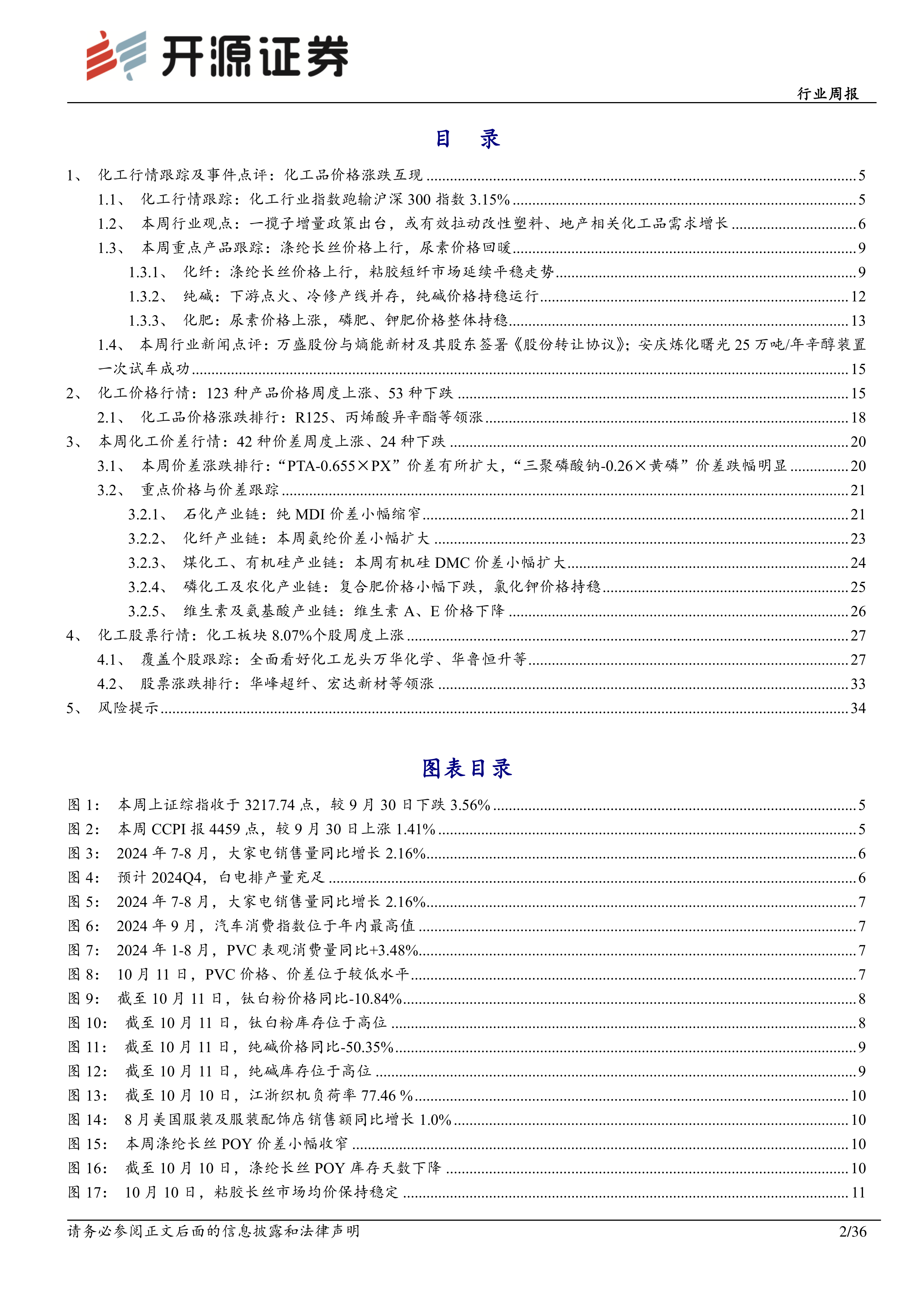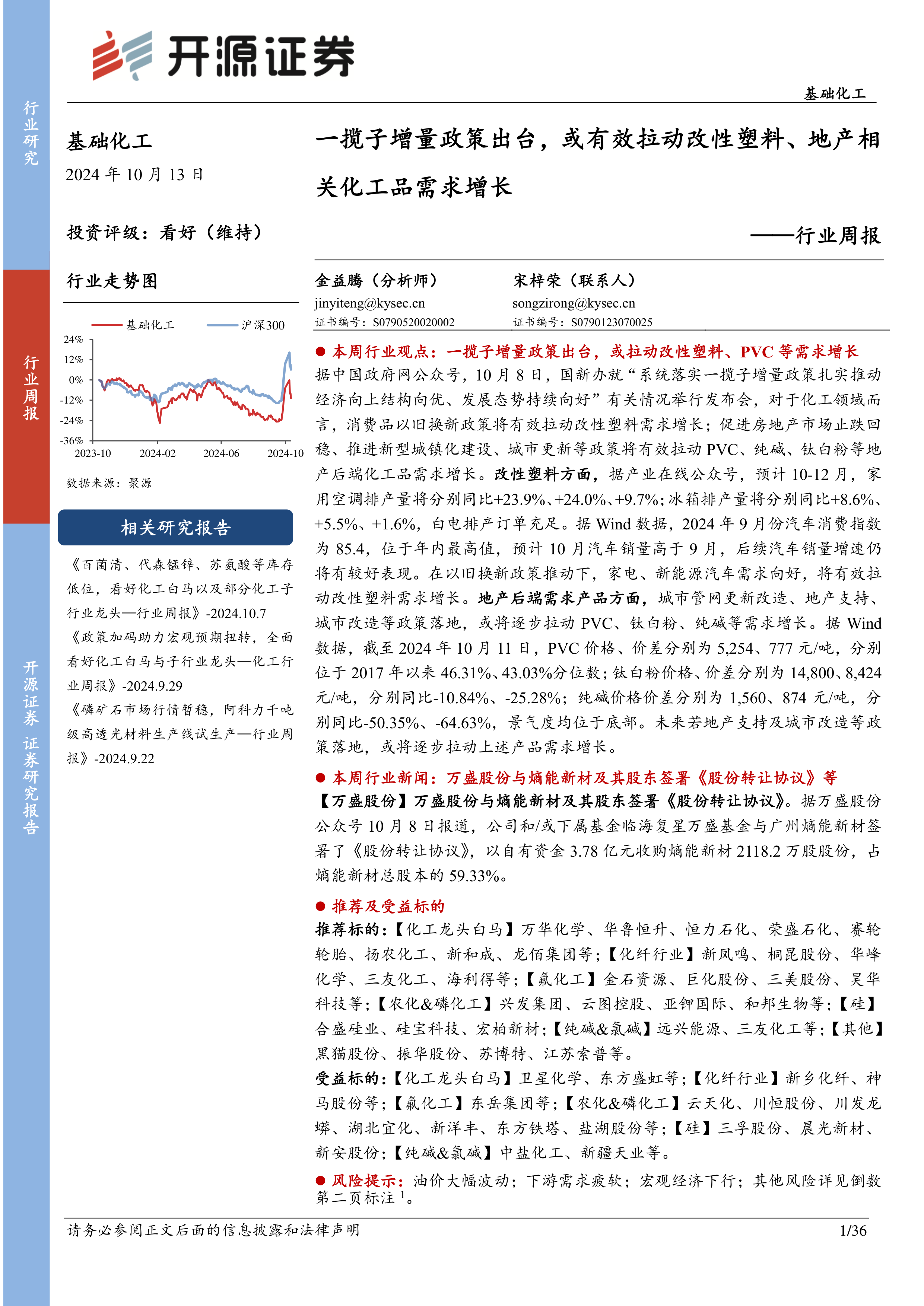 据中国政府网公众号, 10 月 8 日,国新办就“系统落实一揽子增量政策扎实推动经济向上结构向优、发展态势持续向好”有关情况举行发布会,对于化工领域而言,消费品以旧换新政策将有效拉动改性塑料需求增长;促进房地产市场止跌回稳、推进新型城镇化建设、城市更新等政策将有效拉动 PVC、纯碱、钛白粉等地产后端化工品需求增长。 改性塑料方面, 据产业在线公众号,预计 10-12 月,家用空调排产量将分别同比+23.9%、 +24.0%、 +9.7%;冰箱排产量将分别同比+8.6%、+5.5%、 +1.6%,白电排产订单充足。据 Wind 数据, 2024 年 9 月份汽车消费指数为 85.4, 位于年内最高值,预计 10 月汽车销量高于 9 月,后续汽车销量增速仍将有较好表现。 在以旧换新政策推动下,家电、新能源汽车需求向好,将有效拉动改性塑料需求增长。 地产后端需求产品方面, 城市管网更新改造、地产支持、城市改造等政策落地,或将逐步拉动 PVC、钛白粉、纯碱等需求增长。 据 Wind数据, 截至 2024 年 10 月 11 日, PVC 价格、价差分别为 5,254、 777 元/吨, 分别位于 2017 年以来 46.31%、 43.03%分位数; 钛白粉价格、价差分别为 14,800、 8,424元/吨,分别同比-10.84%、 -25.28%; 纯碱价格价差分别为 1,560、 874 元/吨,分别同比-50.35%、 -64.63%,景气度均位于底部。未来若地产支持及城市改造等政策落地,或将逐步拉动上述产品需求增长。