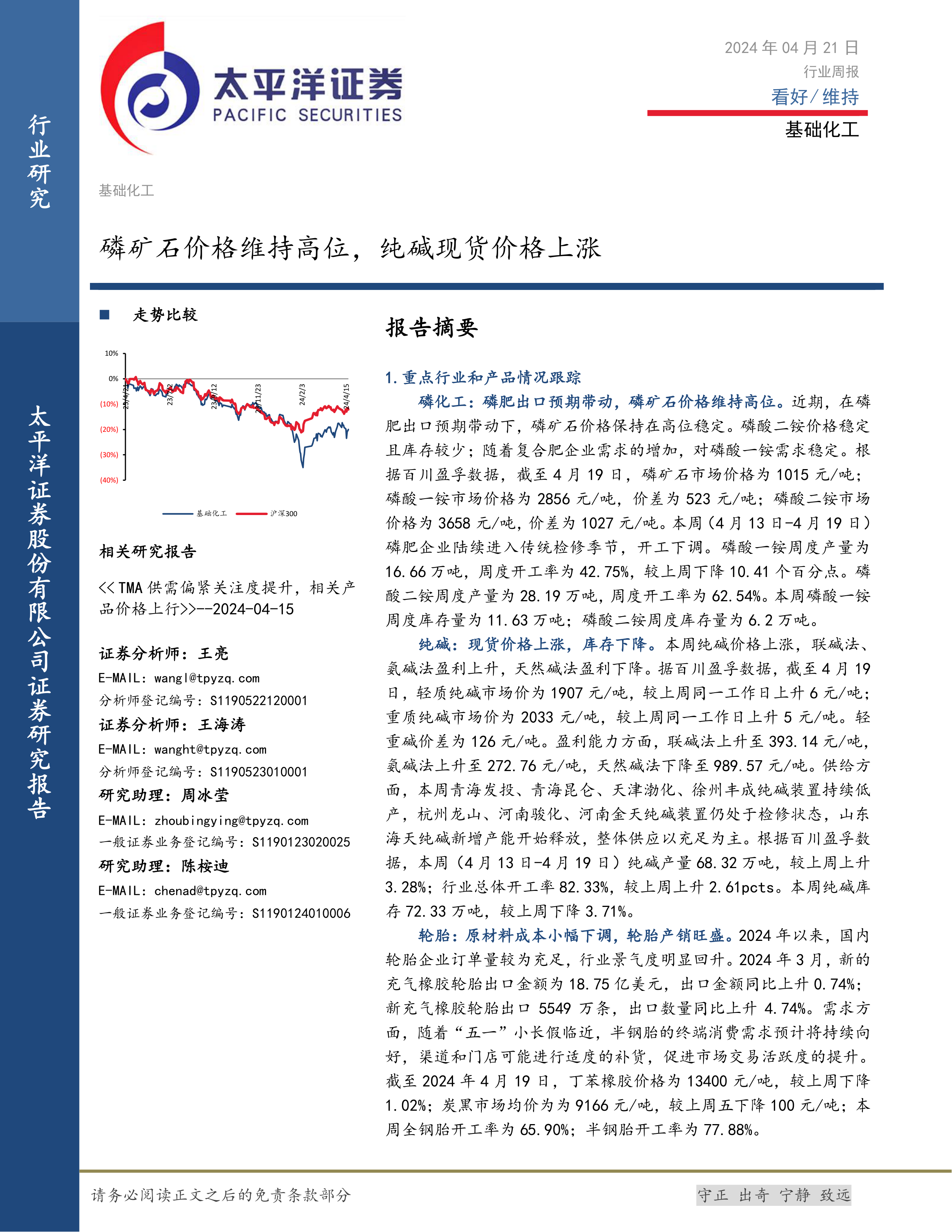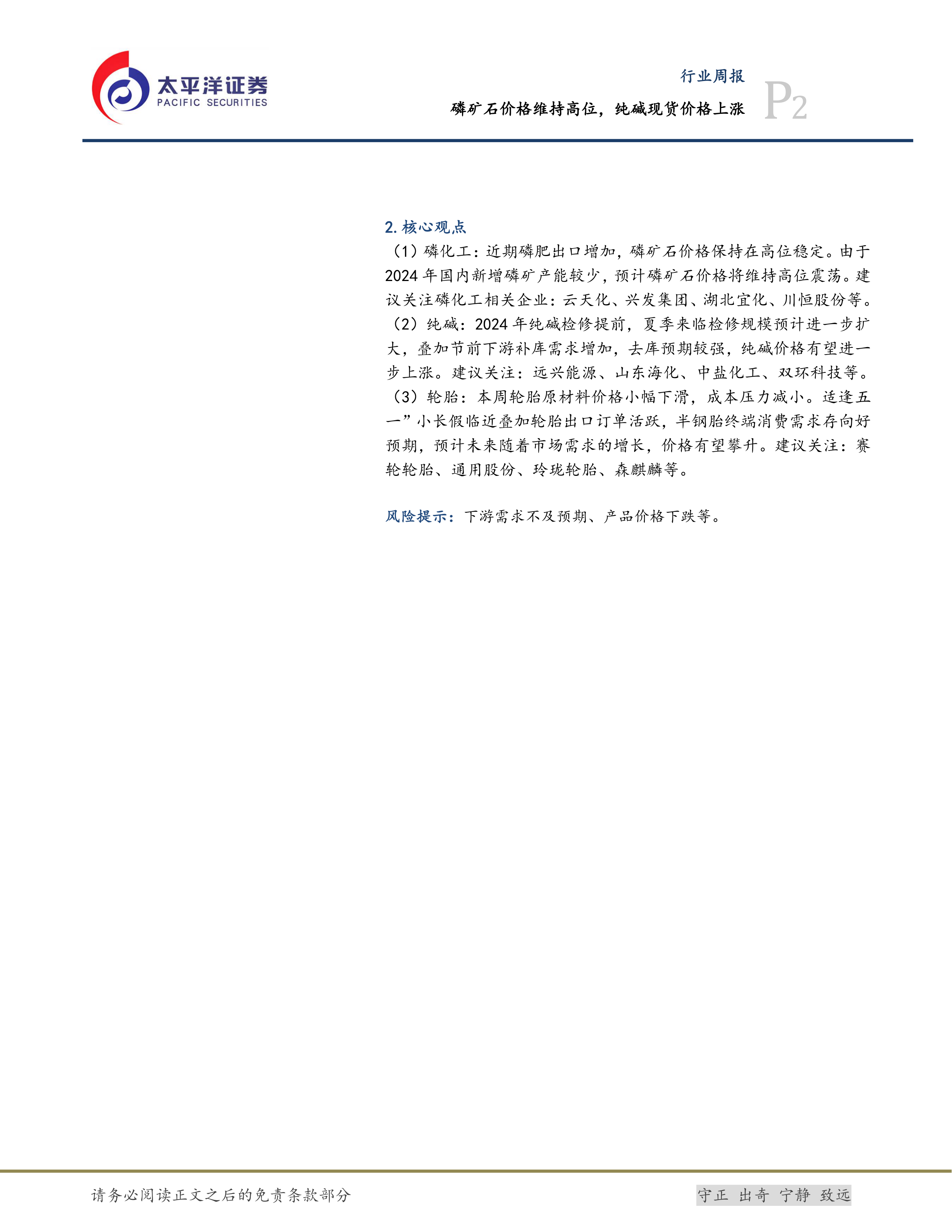 (1)磷化工:近期磷肥出口增加,磷矿石价格保持在高位稳定。由于2024年国内新增磷矿产能较少,预计磷矿石价格将维持高位震荡。建议关注磷化工相关企业:云天化、兴发集团、湖北宜化、川恒股份等。(2)纯碱:2024年纯碱检修提前,夏季来临检修规模预计进一步扩大,叠加节前下游补库需求增加,去库预期较强,纯碱价格有望进一步上涨。建议关注:远兴能源、山东海化、中盐化工、双环科技等。(3)轮胎:本周轮胎原材料价格小幅下滑,成本压力减小。适逢五一”小长假临近叠加轮胎出口订单活跃,半钢胎终端消费需求存向好预期,预计未来随着市场需求的增长,价格有望攀升。建议关注:赛轮轮胎、通用股份、玲珑轮胎、森麒麟等。