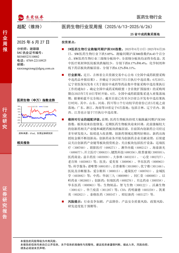 本报告的核心观点是:尽管SW医药生物行业在2025年6月13日至2025年6月26日期间跑输沪深300指数,录得5.05%的跌幅,但考虑到行业估值处于近几年相对低位,且创新药领域利好频出,维持对该行业的超配评级。 报告重点关注创新药产业链、医疗设备、医药商业、医美、科学服务、医院及诊断服务以及中药等板块的投资机会,并提示了行业竞争加剧、产品降价、政策风险等潜在风险。