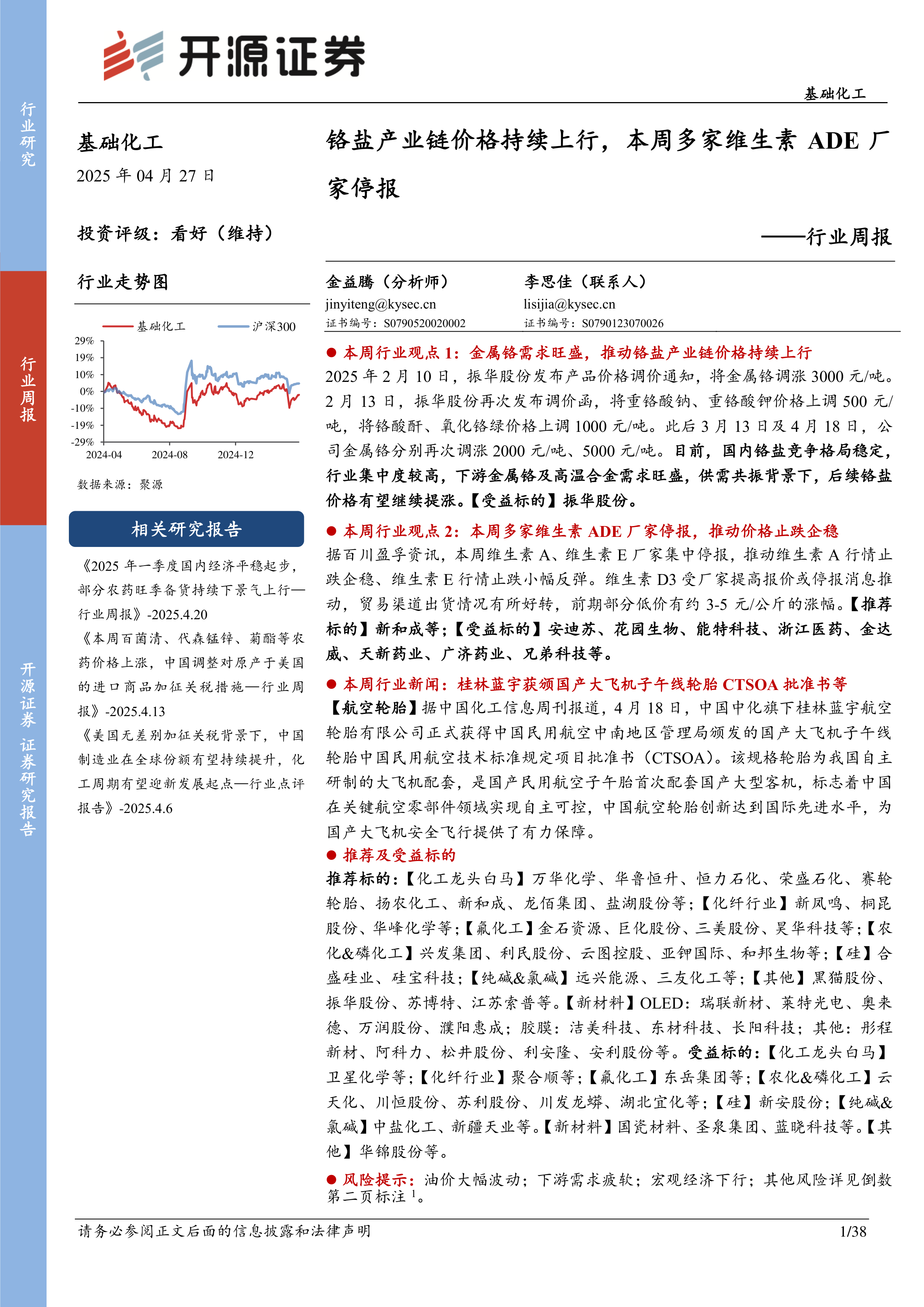 基础化工行业周报:铬盐产业链价格持续上行,本周多家维生素ADE厂家停报