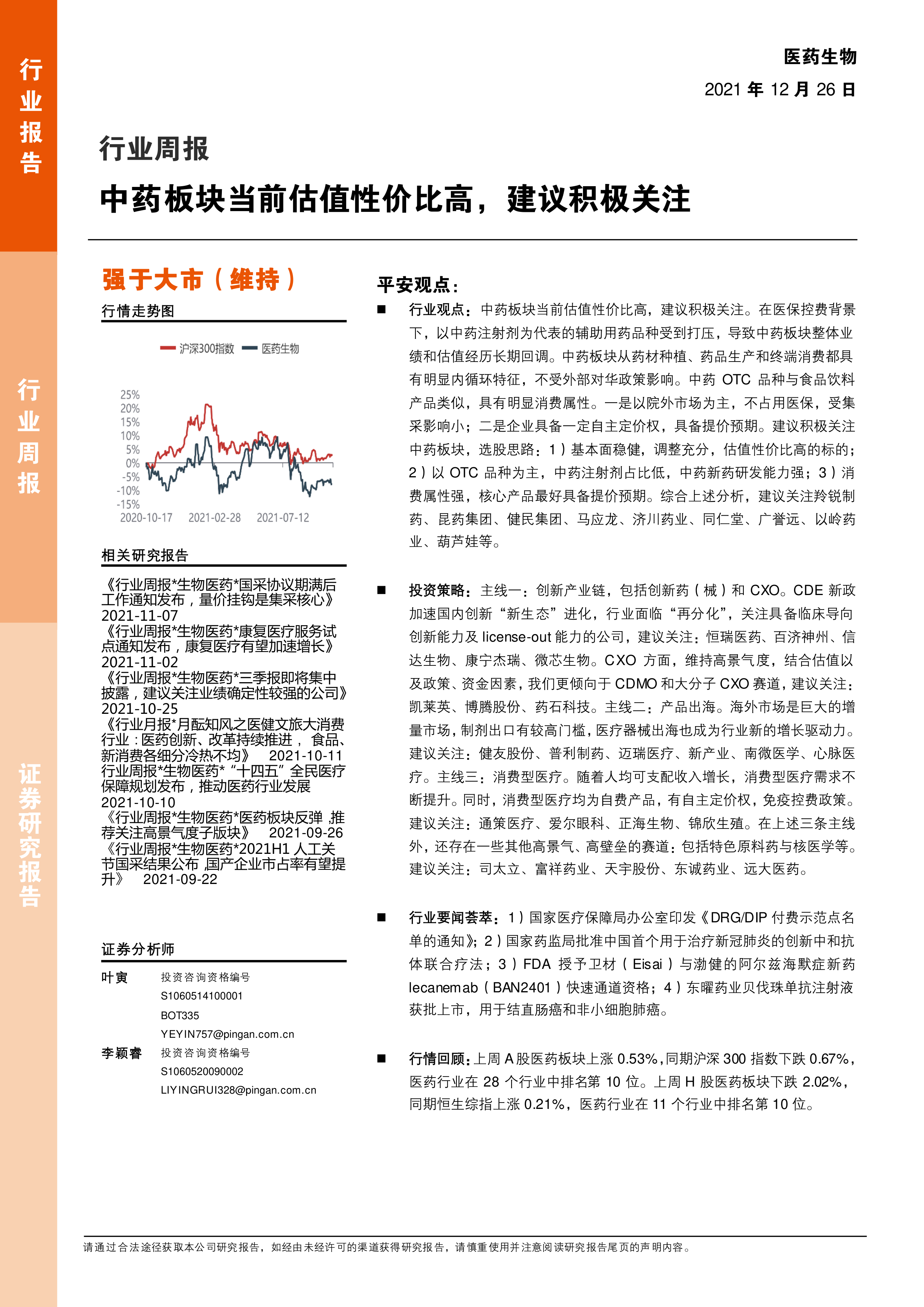 行业观点:中药板块当前估值性价比高,建议积极关注。在医保控费背景下,以中药注射剂为代表的辅助用药品种受到打压,导致中药板块整体业绩和估值经历长期回调。中药板块从药材种植、药品生产和终端消费都具有明显内循环特征,不受外部对华政策影响。中药OTC品种与食品饮料产品类似,具有明显消费属性。一是以院外市场为主,不占用医保,受集采影响小;二是企业具备一定自主定价权,具备提价预期。建议积极关注中药板块,选股思路:1)基本面稳健,调整充分,估值性价比高的标的;2)以OTC品种为主,中药注射剂占比低,中药新药研发能力强;3)消费属性强,核心产品最好具备提价预期。综合上述分析,建议关注羚锐制药、昆药集团、健民集团、马应龙、济川药业、同仁堂、广誉远、以岭药业、葫芦娃等。