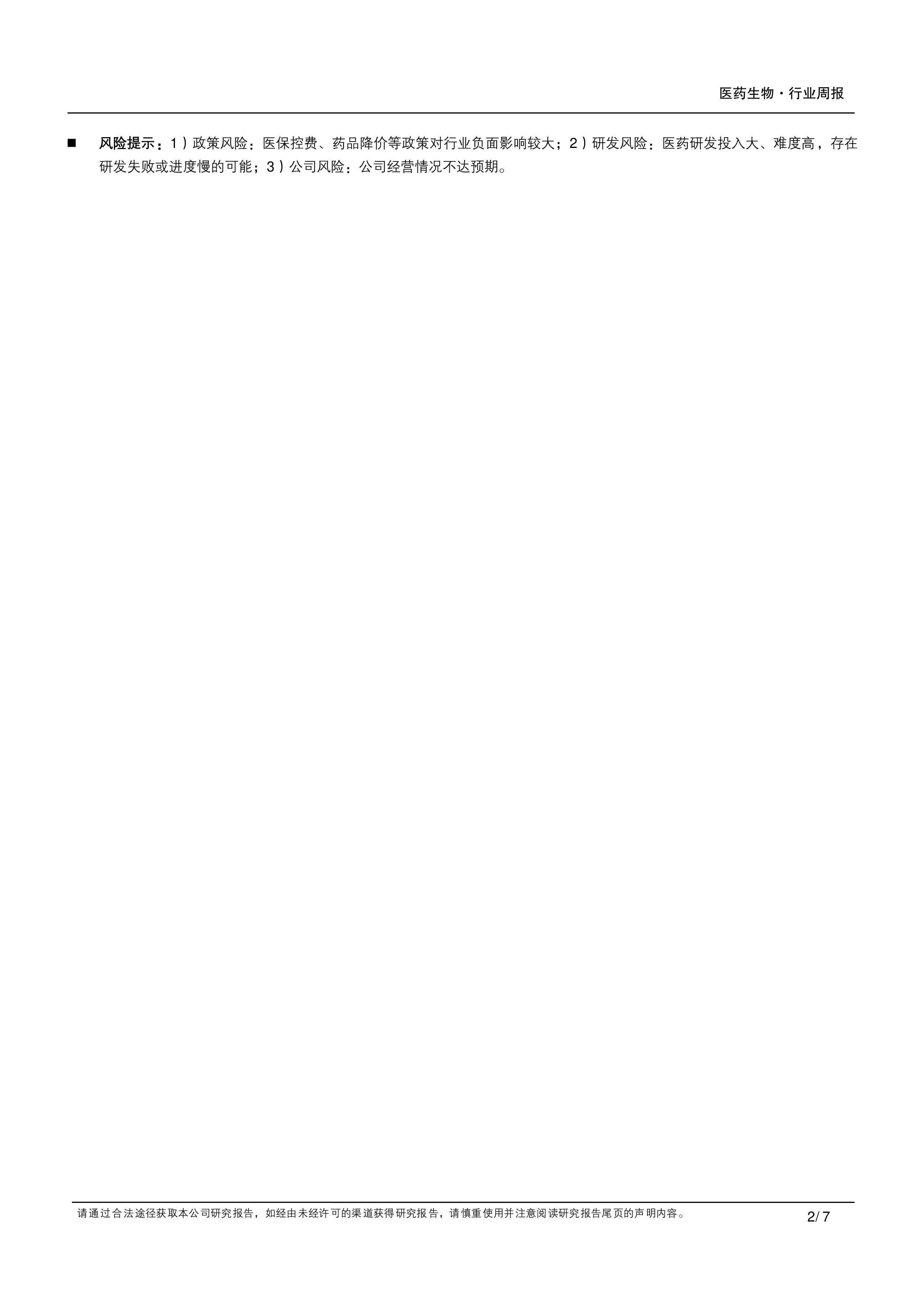 风险提示:1)政策风险:医保控费、药品降价等政策对行业负面影响较大;2)研发风险:医药研发投入大、难度高,存在研发失败或进度慢的可能;3)公司风险:公司经营情况不达预期。