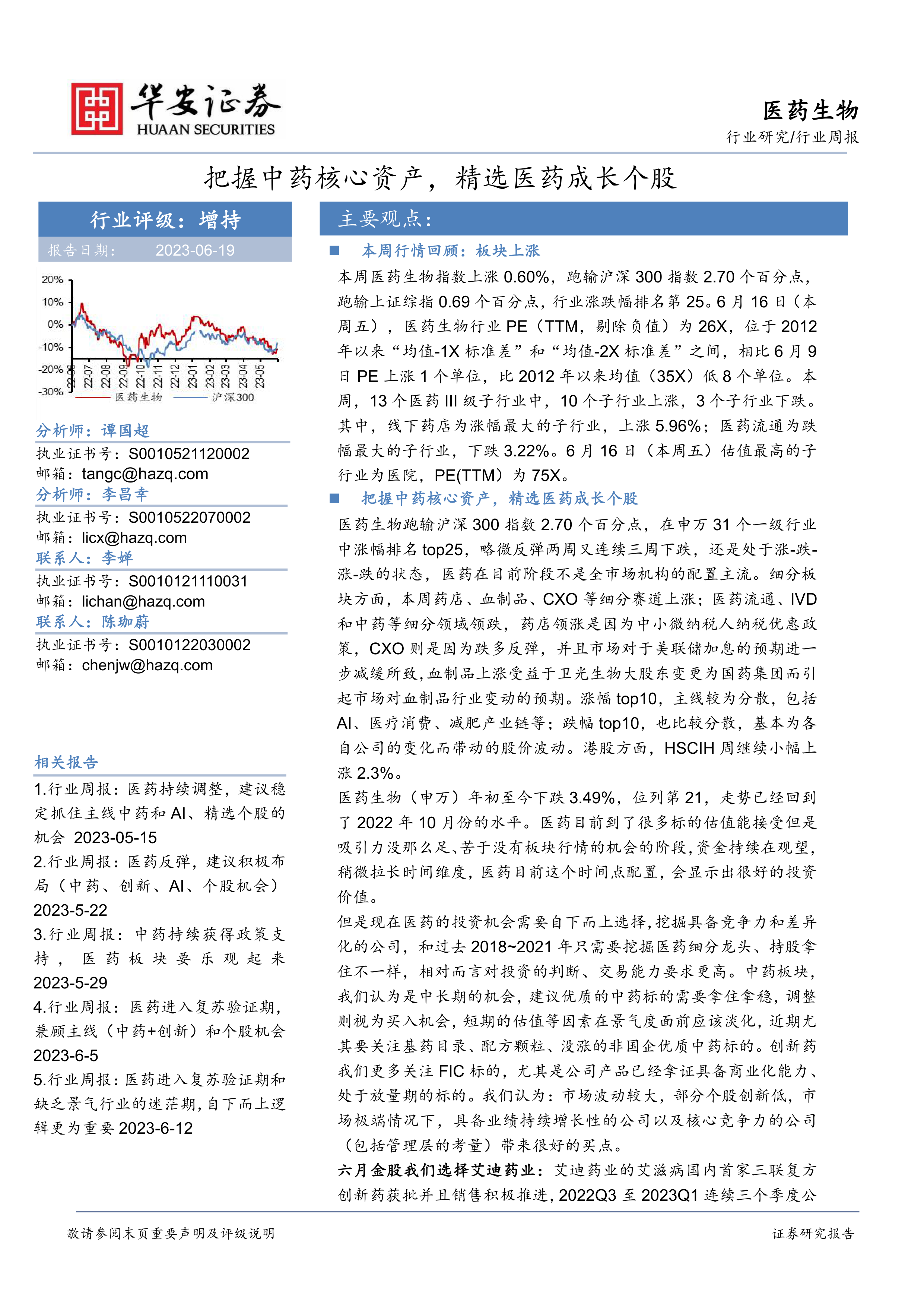 本报告对医药生物行业本周行情进行了回顾,并对中药和创新药板块的投资机会进行了分析。报告指出,当前医药行业投资需谨慎,应采取自下而上的选股策略,关注具备持续增长潜力和核心竞争力的公司。 报告推荐了艾迪药业等个股,并对其他一些个股进行了观点更新,为投资者提供了参考。 同时,报告也对港股创新药市场进行了分析,并对未来发展趋势进行了展望。 总而言之,报告强调了在当前市场环境下,深入研究个股基本面,选择具备竞争优势和增长潜力的公司至关重要。