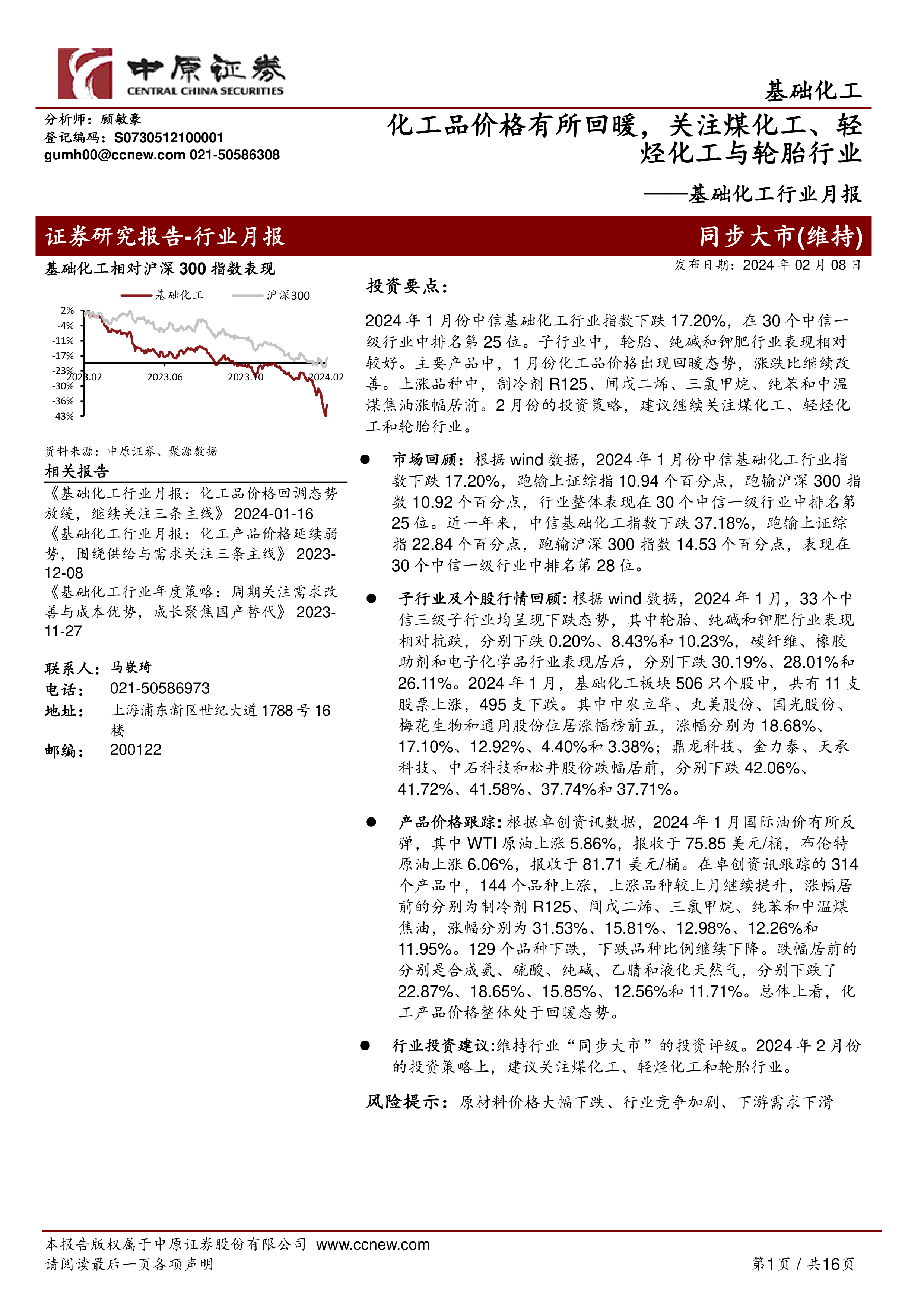 行业投资建议:维持行业“同步大市”的投资评级。2024年2月份的投资策略上,建议关注煤化工、轻烃化工和轮胎行业。