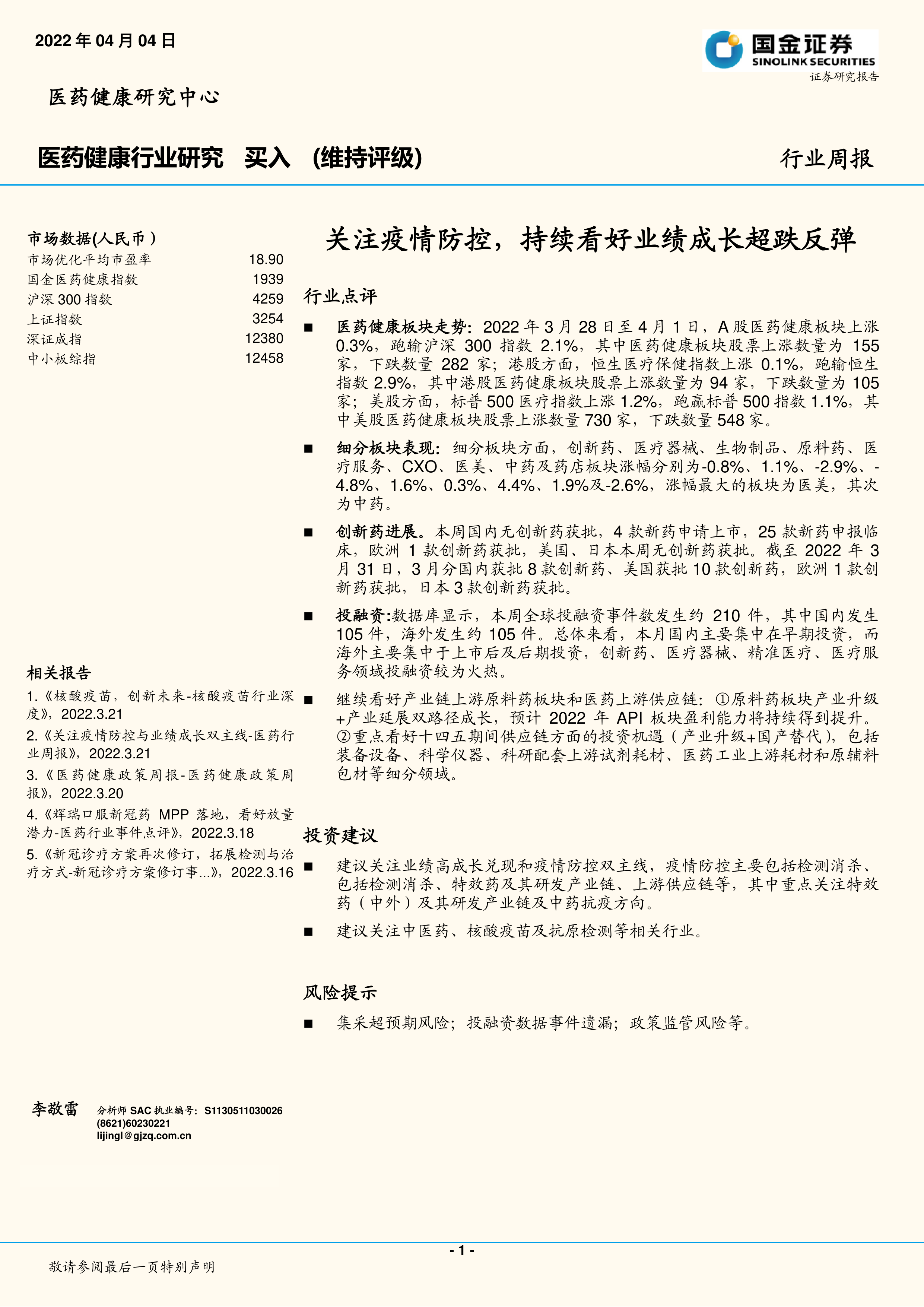 本报告对2022年4月第一周的医药健康行业市场进行了全面的分析,涵盖了市场表现、细分板块、投融资、政策事件以及行业展望等多个方面。报告数据显示,医药健康行业市场表现分化,不同板块的涨跌幅度差异较大。 报告建议投资者关注业绩高成长兑现和疫情防控两条主线,并对部分细分行业提出了具体的投资建议。 然而,投资者仍需注意集采降价、政策监管以及市场风险等因素。 本报告仅供参考,不构成投资建议。