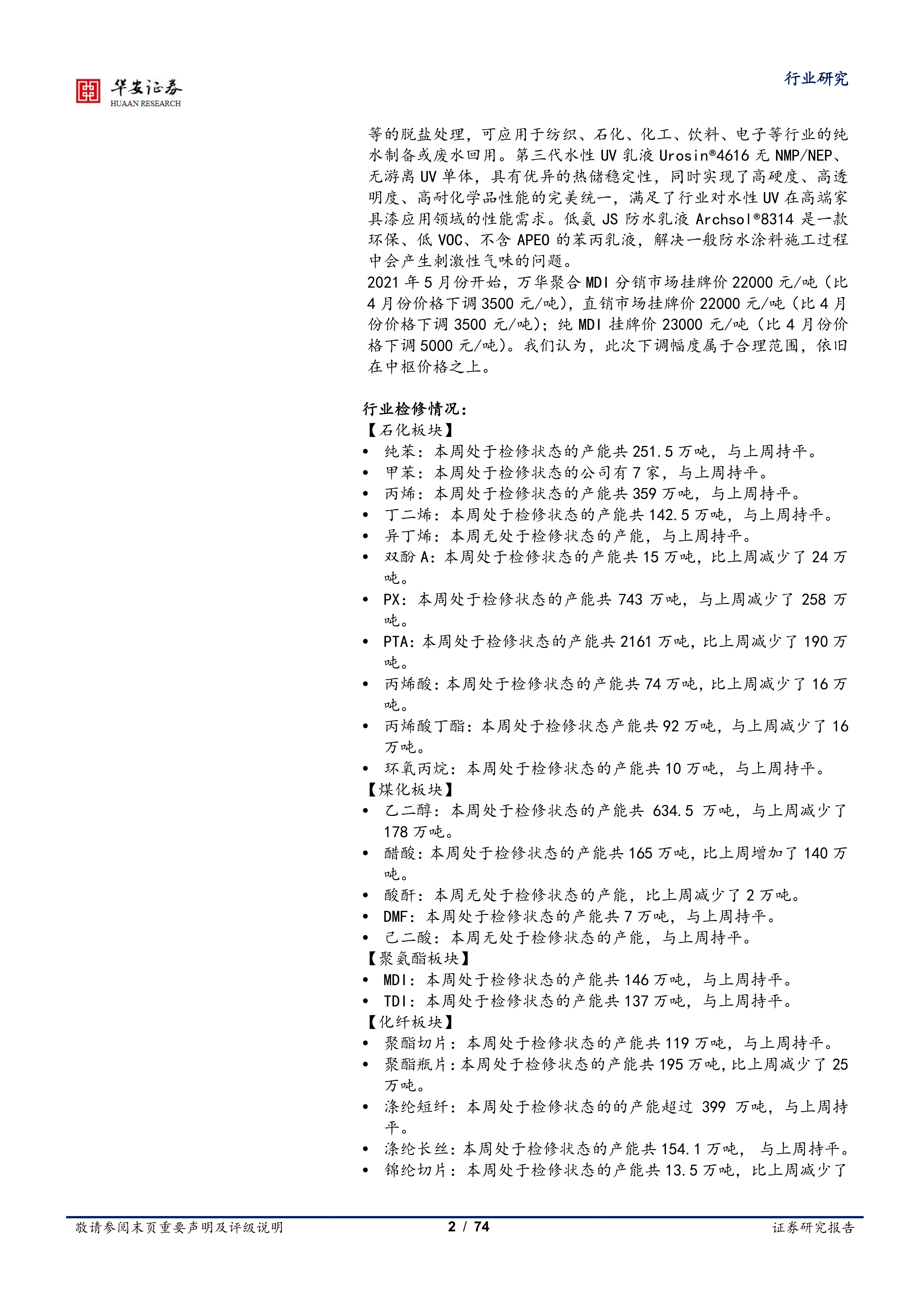 2021 年 5 月份开始, 万华聚合 MDI 分销市场挂牌价 22000 元/吨(比4 月份价格下调 3500 元/吨),直销市场挂牌价 22000 元/吨(比 4 月份价格下调 3500 元/吨);纯 MDI 挂牌价 23000 元/吨(比 4 月份价格下调 5000 元/吨)。 我们认为,此次下调幅度属于合理范围,依旧在中枢价格之上。
