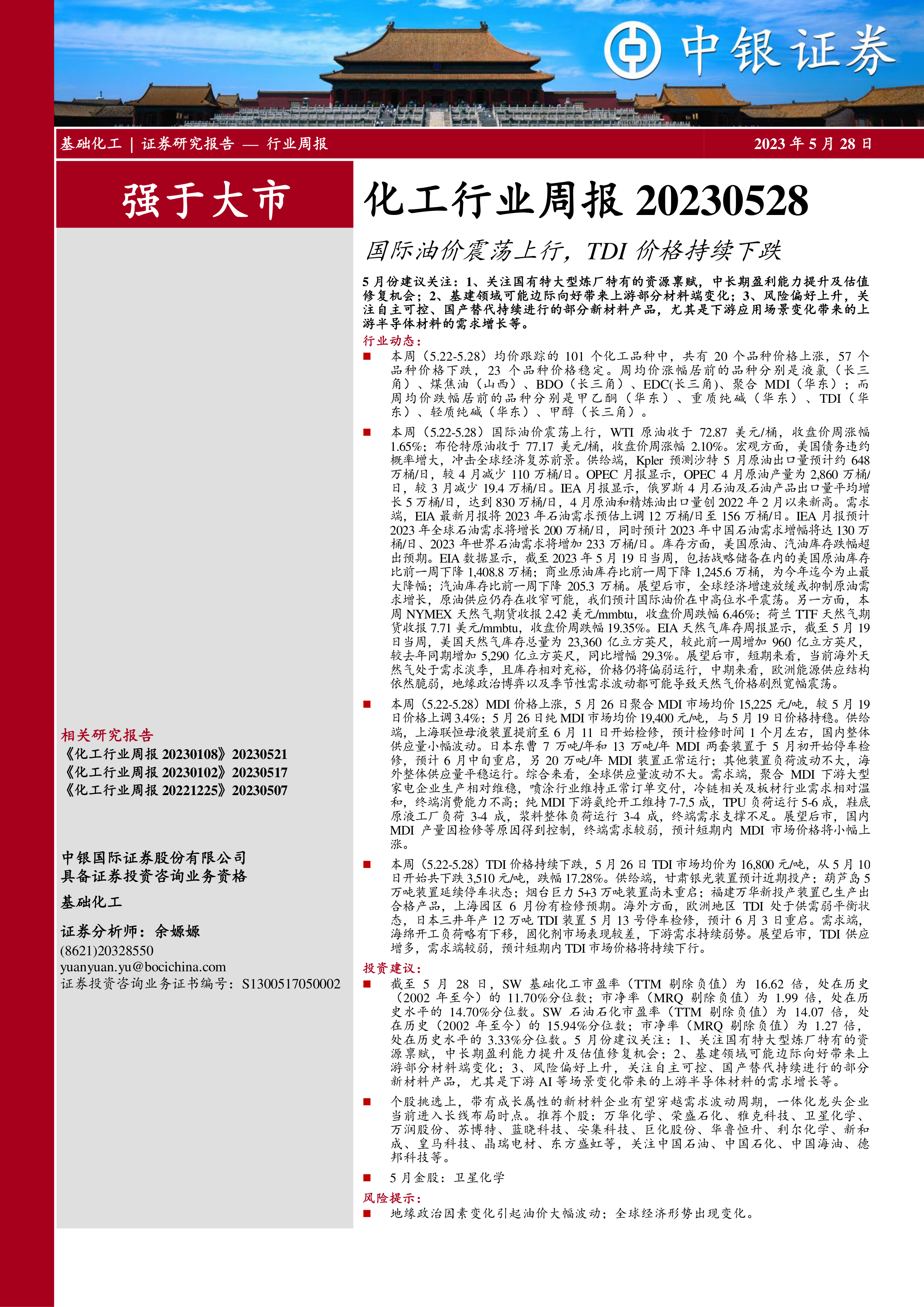 化工行业周报:国际油价震荡上行,TDI价格持续下跌