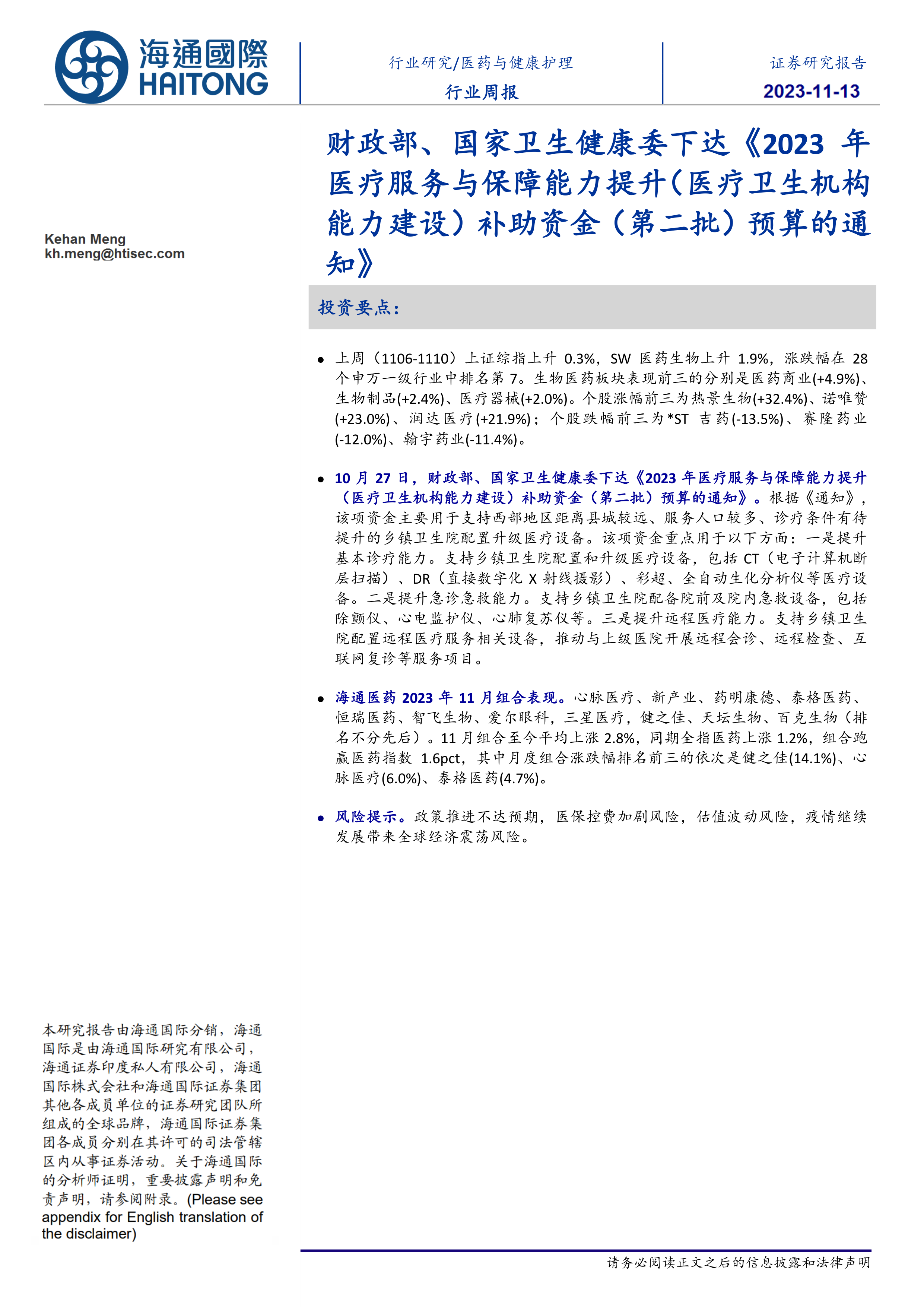 医药与健康护理行业周报:财政部、国家卫生健康委下达《2023年医疗服务与保障能力提升(医疗卫生机构能力建设)补助资金(第二批)预算的通知》