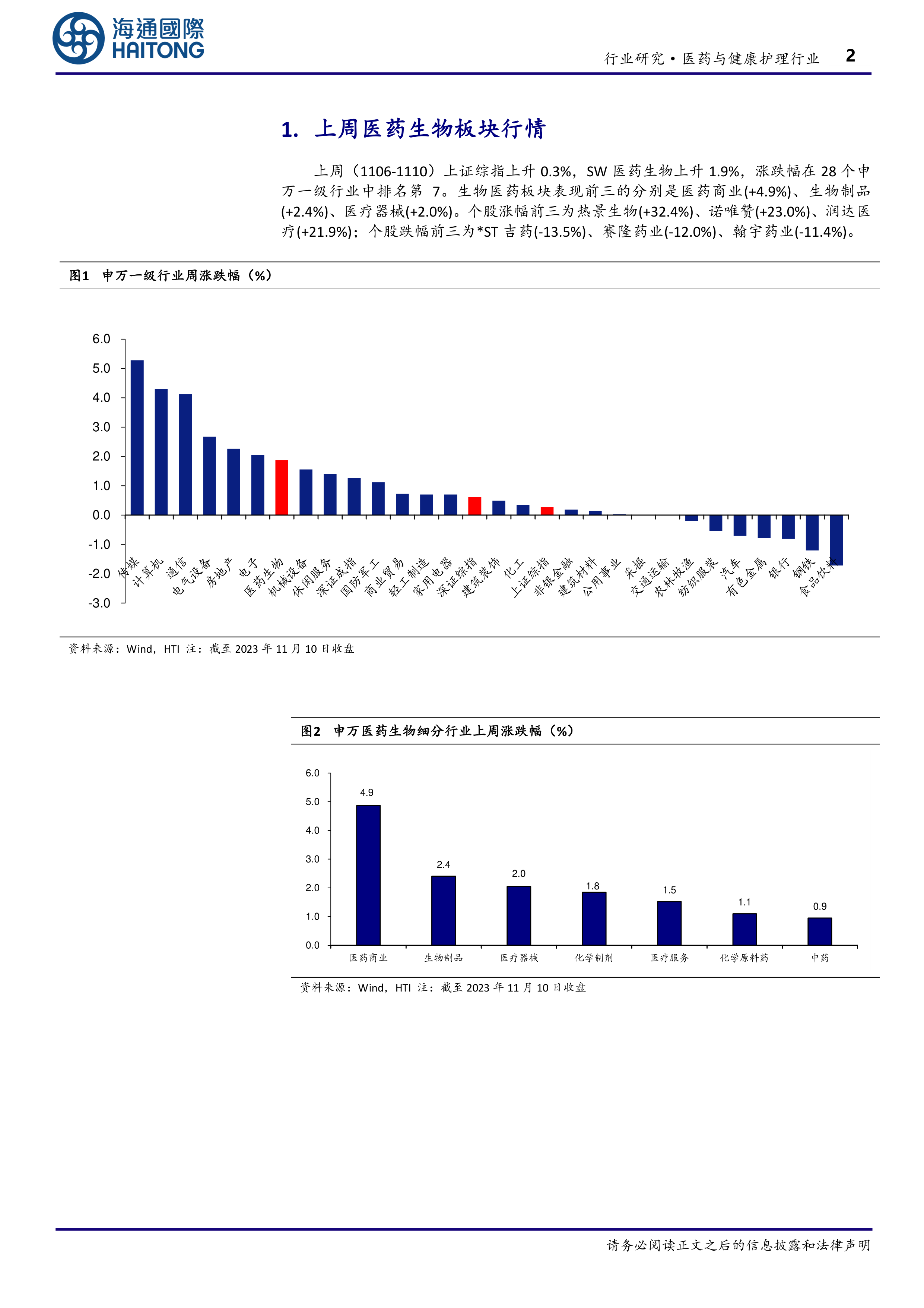 上周(1106-1110)上证综指上升0.3%,SW医药生物上升1.9%,涨跌幅在28个申万一级行业中排名第7。生物医药板块表现前三的分别是医药商业(+4.9%)、生物制品(+2.4%)、医疗器械(+2.0%)。个股涨幅前三为热景生物(+32.4%)、诺唯赞(+23.0%)、润达医疗(+21.9%);个股跌幅前三为*ST吉药(-13.5%)、赛隆药业(-12.0%)、翰宇药业(-11.4%)。