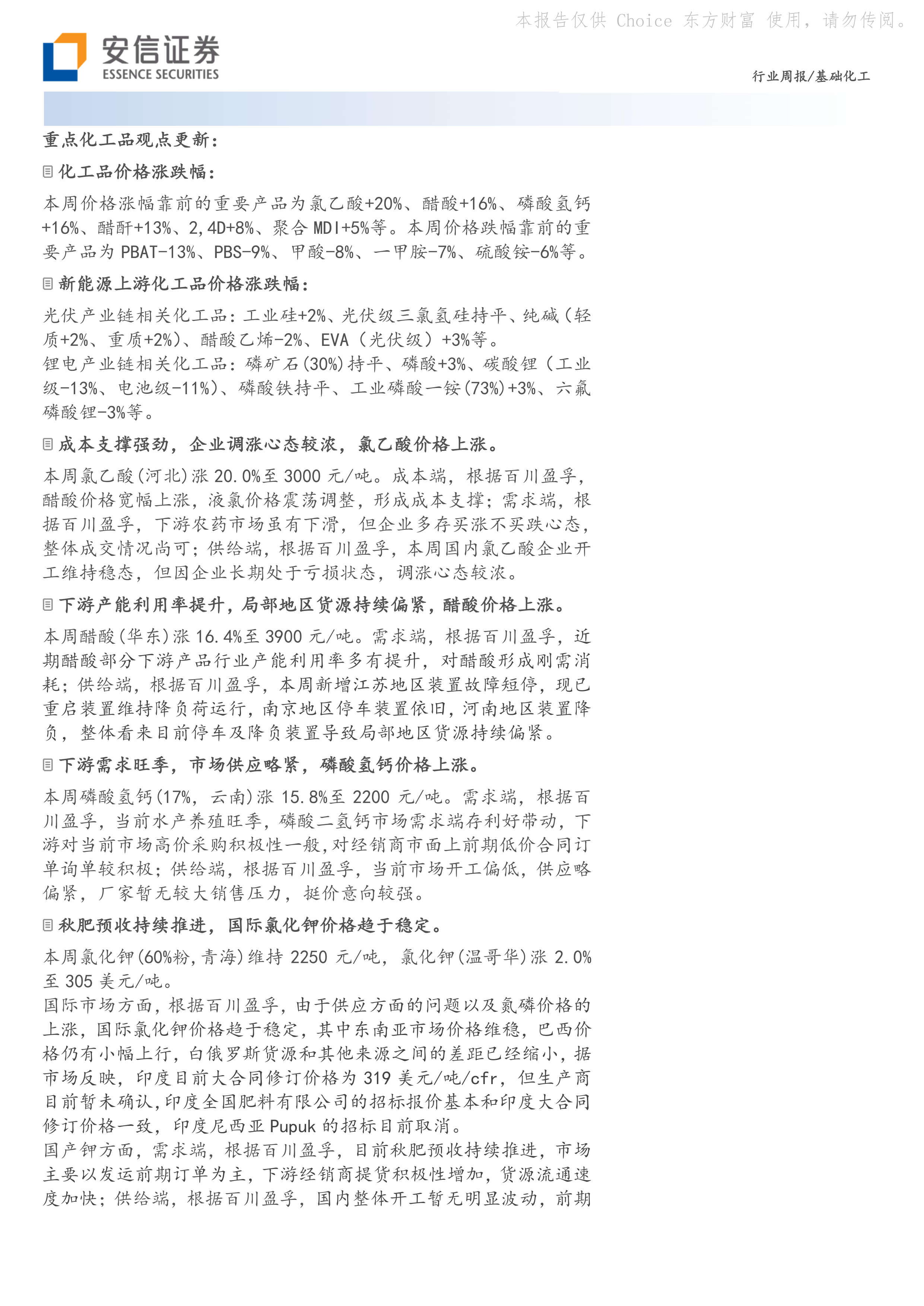 本报告的核心观点是:本周基础化工行业整体表现强劲,部分产品价格上涨,主要受成本支撑强劲、下游需求旺盛以及供应偏紧等因素驱动。然而,油价下跌以及全球宏观经济下行风险仍需关注。