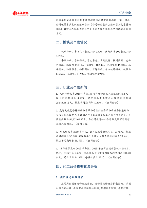 本节简要介绍了部分化工企业发布的年报以及其他重要新闻,例如飞凯材料、威海光威复合材料、珀莱雅和万华化学的业绩公告。