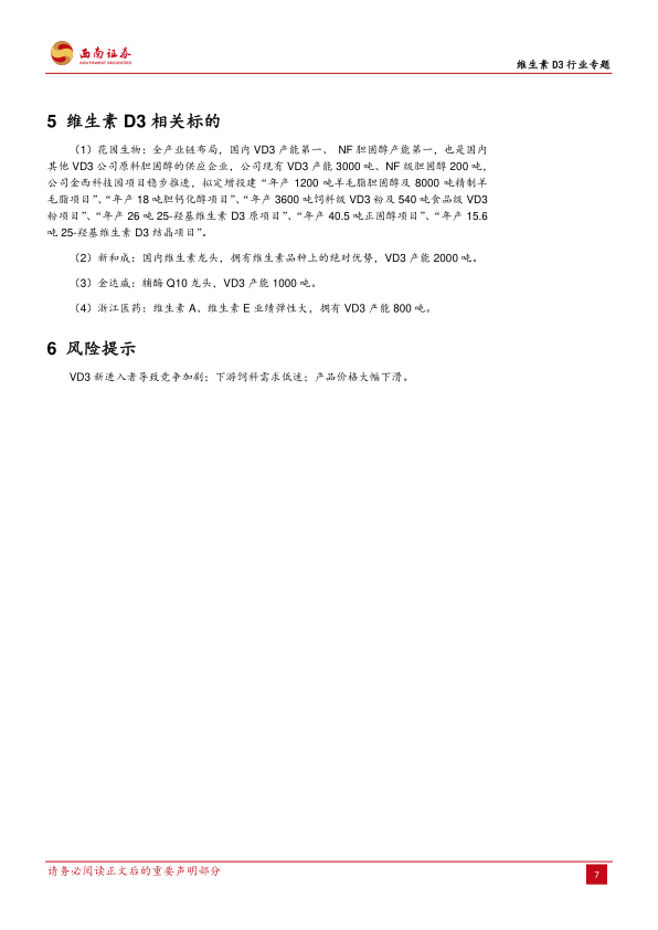 报告介绍了国内主要的VD3生产企业,包括花园生物、新和成、金达威、浙江医药等,并对这些企业的产能、竞争优势等进行了简要分析。最后,报告还指出了VD3行业面临的风险,例如新进入者导致竞争加剧、下游饲料需求低迷、产品价格大幅下滑等。