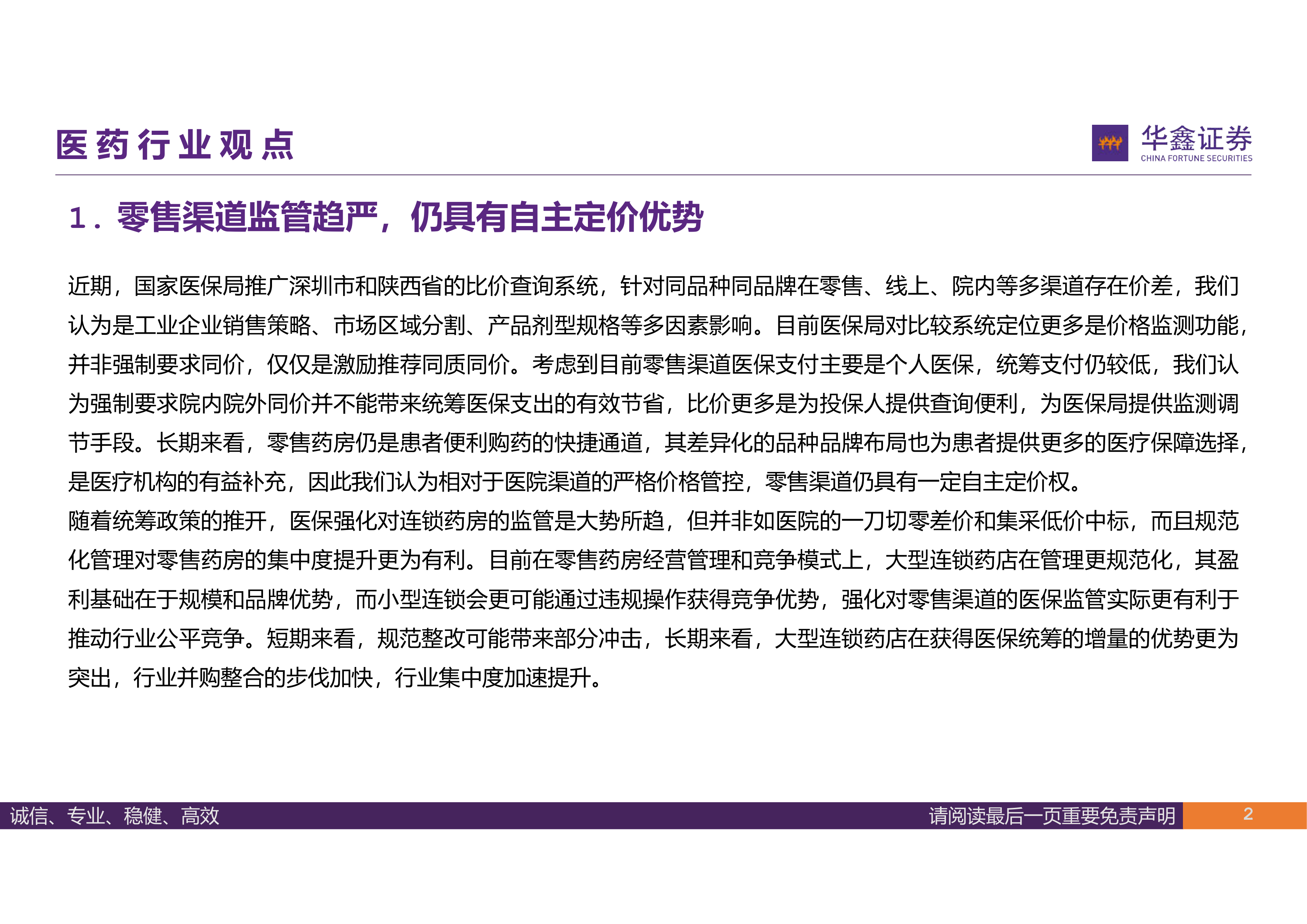 近期,国家医保局推广深圳市和陕西省的比价查询系统,针对同品种同品牌在零售、线上、院内等多渠道存在价差,我们认为是工业企业销售策略、市场区域分割、产品剂型规格等多因素影响。目前医保局对比较系统定位更多是价格监测功能,并非强制要求同价,仅仅是激励推荐同质同价。考虑到目前零售渠道医保支付主要是个人医保,统筹支付仍较低,我们认为强制要求院内院外同价并不能带来统筹医保支出的有效节省,比价更多是为投保人提供查询便利,为医保局提供监测调节手段。长期来看,零售药房仍是患者便利购药的快捷通道,其差异化的品种品牌布局也为患者提供更多的医疗保障选择,是医疗机构的有益补充,因此我们认为相对于医院渠道的严格价格管控,零售渠道仍具有一定自主定价权。随着统筹政策的推开,医保强化对连锁药房的监管是大势所趋,但并非如医院的一刀切零差价和集采低价中标,而且规范化管理对零售药房的集中度提升更为有利。目前在零售药房经营管理和竞争模式上,大型连锁药店在管理更规范化,其盈利基础在于规模和品牌优势,而小型连锁会更可能通过违规操作获得竞争优势,强化对零售渠道的医保监管实际更有利于推动行业公平竞争。短期来看,规范整改可能带来部分冲击,长期来看,大型连锁药店在获得医保统筹的增量的优势更为突出,行业并购整合的步伐加快,行业集中度加速提升。