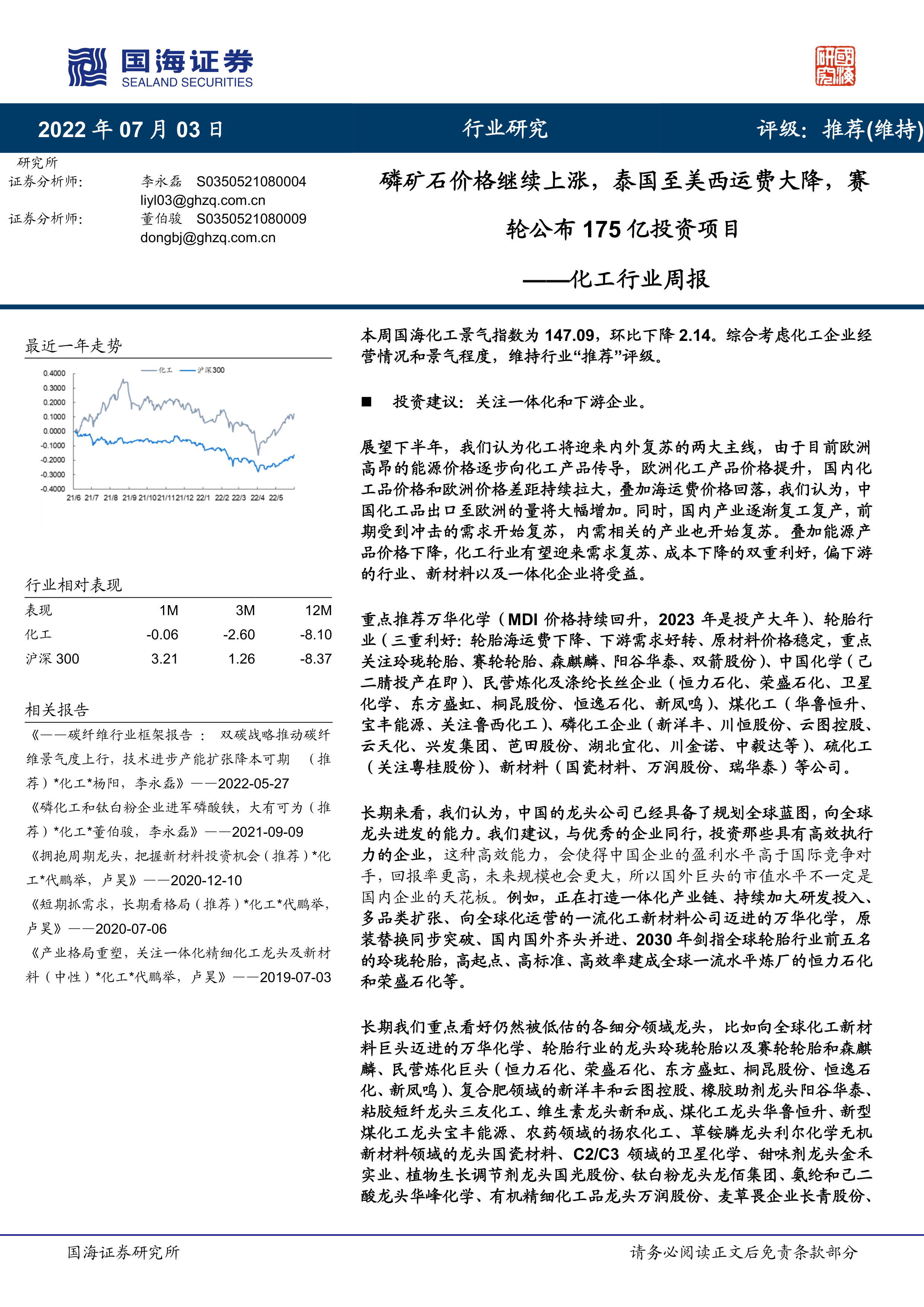 重点推荐万华化学(MDI价格持续回升,2023年是投产大年)、轮胎行业(三重利好:轮胎海运费下降、下游需求好转、原材料价格稳定,重点关注玲珑轮胎、赛轮轮胎、森麒麟、阳谷华泰、双箭股份)、中国化学(己二腈投产在即)、民营炼化及涤纶长丝企业(恒力石化、荣盛石化、卫星化学、东方盛虹、桐昆股份、恒逸石化、新凤鸣)、煤化工(华鲁恒升、宝丰能源、关注鲁西化工)、磷化工企业(新洋丰、川恒股份、云图控股、云天化、兴发集团、芭田股份、湖北宜化、川金诺、中毅达等)、硫化工(关注粤桂股份)、新材料(国瓷材料、万润股份、瑞华泰)等公司。