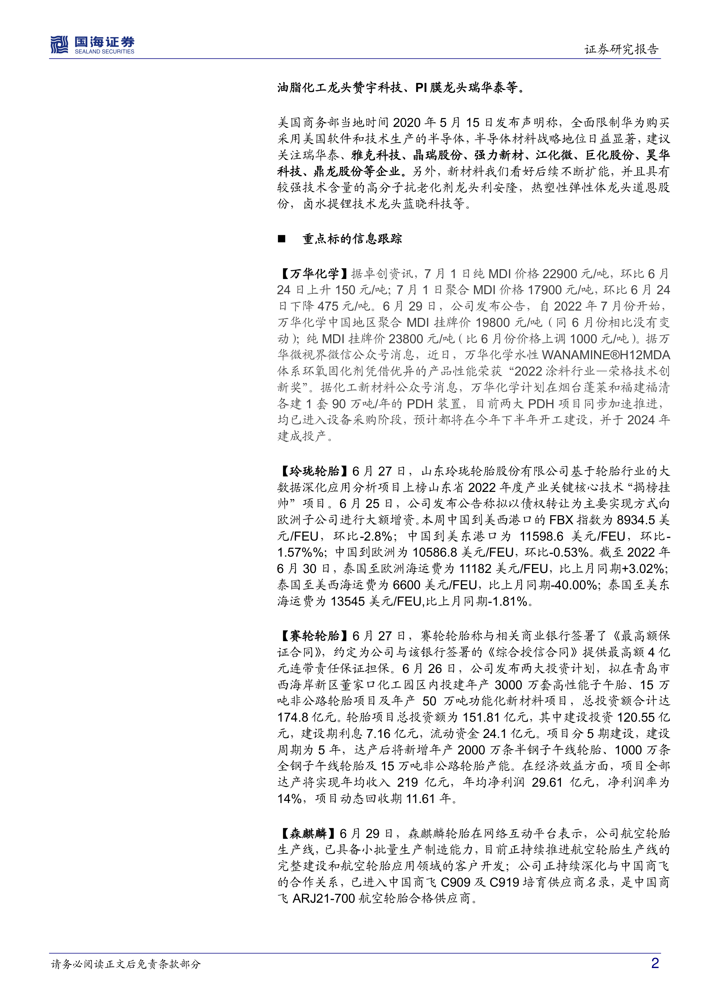 报告首先对国海化工景气指数进行了分析,并基于此维持了化工行业的“推荐”评级。随后,报告对多个重点化工公司的近期表现进行了跟踪,包括:万华化学(MDI价格走势、新项目进展)、玲珑轮胎(大数据项目、欧洲增资)、赛轮轮胎(巨额投资计划)、森麒麟(航空轮胎进展)、恒力石化(PTA和涤纶长丝价格、项目规划调整)、荣盛石化(股票回购)、东方盛虹(PTA项目投资)、恒逸石化(股票回购)、卫星化学(丙烯酸价格、能源合作)、桐昆股份(股票回购)、新凤鸣(股票回购)、新洋丰(磷酸一铵价格、募集资金账户注销)、云图控股、龙佰集团(股权转让)、中毅达、双箭股份、中国化学、阳谷华泰、华峰化学、新和成(维生素价格)、三友化工(粘胶短纤和纯碱价格)、华鲁恒升(乙二醇和尿素价格)、宝丰能源(焦炭项目、内蒙项目)、国瓷材料、金禾实业(股票回购)、瑞华泰(股东减持)、赞宇科技、万润股份(业绩预告)、扬农化工(功夫菊酯价格)、利尔化学(可转债转股)、国光股份(股权转让、增资)、道恩股份(股票期权调整)、三棵树(新公司设立)、江化微、金发科技、蓝晓科技(碳酸锂项目)、雅克科技、利安隆(股权转让、增资)、粤桂股份(硫磺和硫酸价格)。 报告中包含了大量图表数据,直观地展现了各公司及相关产品的价格、库存等信息。