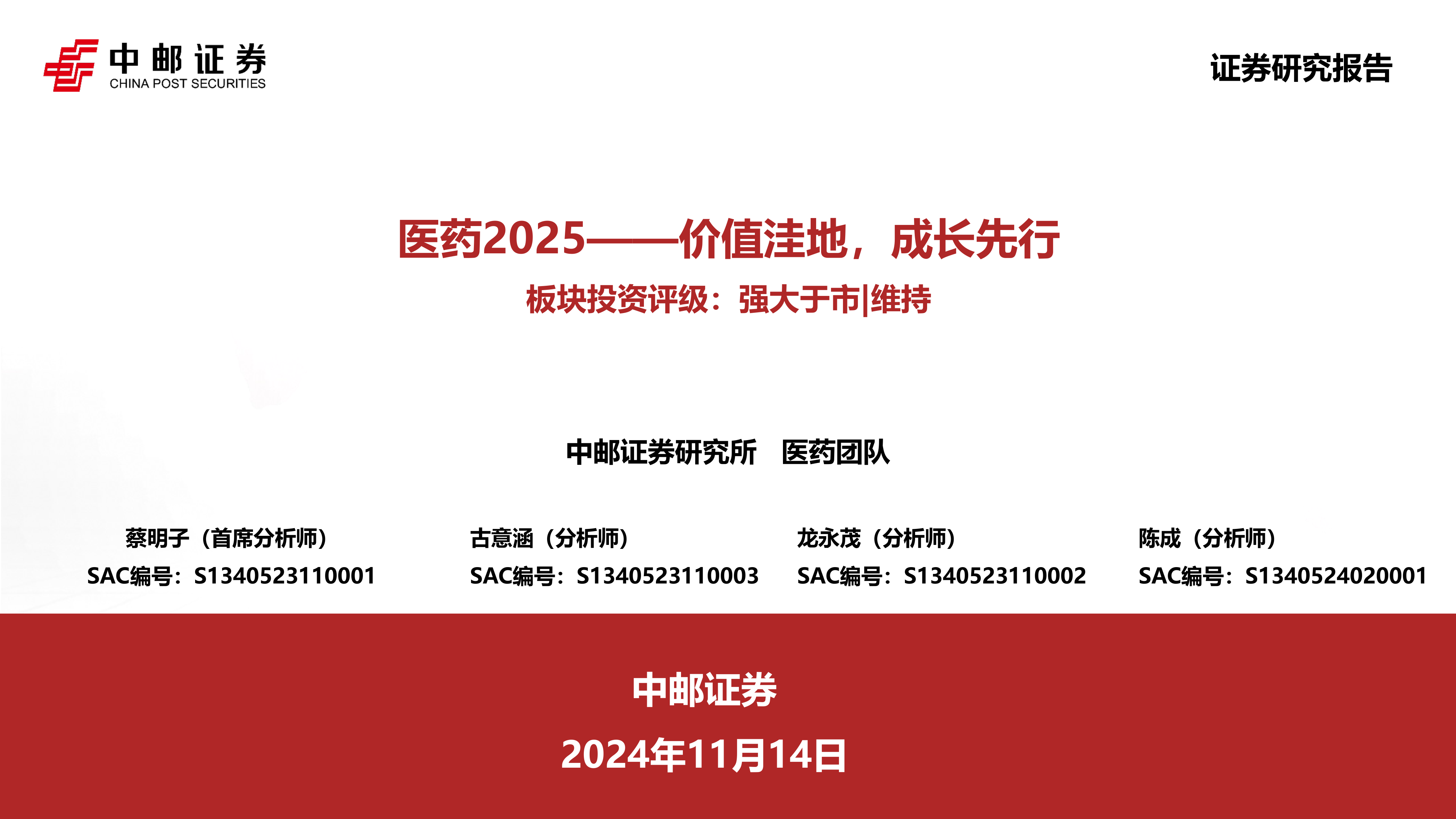 本报告对2025年医药板块的市场前景进行了全面而深入的分析,指出医药板块整体估值处于历史低位,具备较高的投资价值,但同时也存在显著的分化。报告建议投资者关注创新药械、CXO、院外消费及医疗服务以及医疗器械等细分领域的结构性机会,并提示了集采降价超预期、消费复苏不及预期以及企业外延并购落地低于预期等风险。 报告对多个细分领域的龙头企业进行了深入分析,并提供了具体的投资建议,为投资者提供了较为全面的参考信息。 投资者应结合自身风险承受能力和投资目标,谨慎决策。