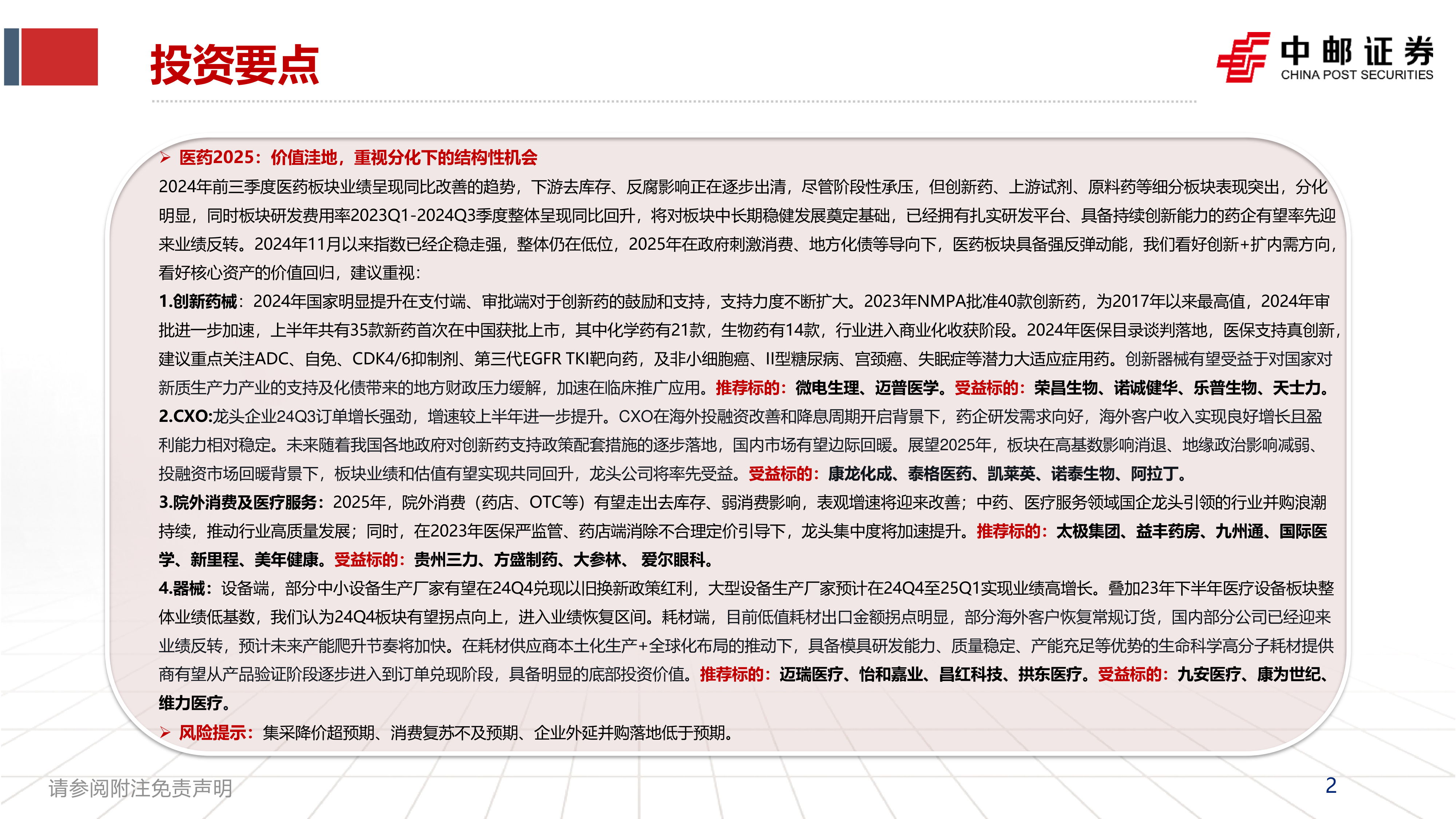 3.院外消费及医疗服务:2025年,院外消费(药店、OTC等)有望走出去库存、弱消费影响,表观增速将迎来改善;中药、医疗服务领域国企龙头引领的行业并购浪潮持续,推动行业高质量发展;同时,在2023年医保严监管、药店端消除不合理定价引导下,龙头集中度将加速提升。推荐标的:太极集团、益丰药房、九州通、国际医学、新里程、美年健康。受益标的:贵州三力、方盛制药、大参林、爱尔眼科。