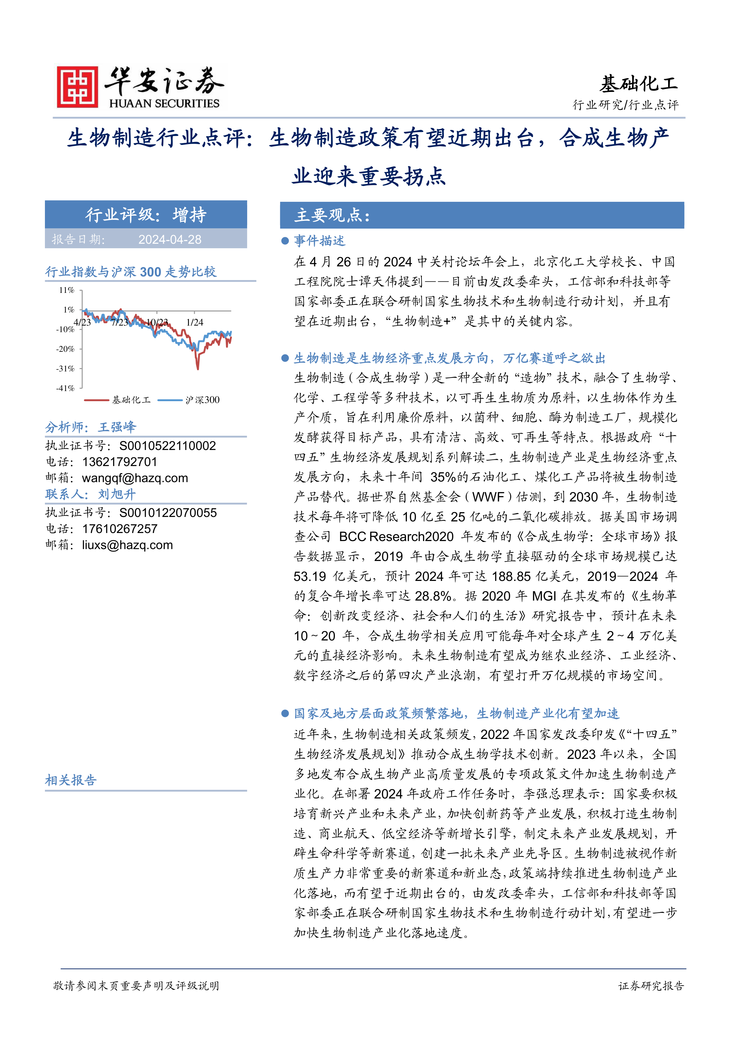 本报告的核心观点是:生物制造产业正迎来重要拐点,国家政策的支持将加速其产业化进程,并有望打开万亿规模的市场空间。 具体而言,报告从政策利好、市场前景以及投资建议三个方面进行了深入分析。