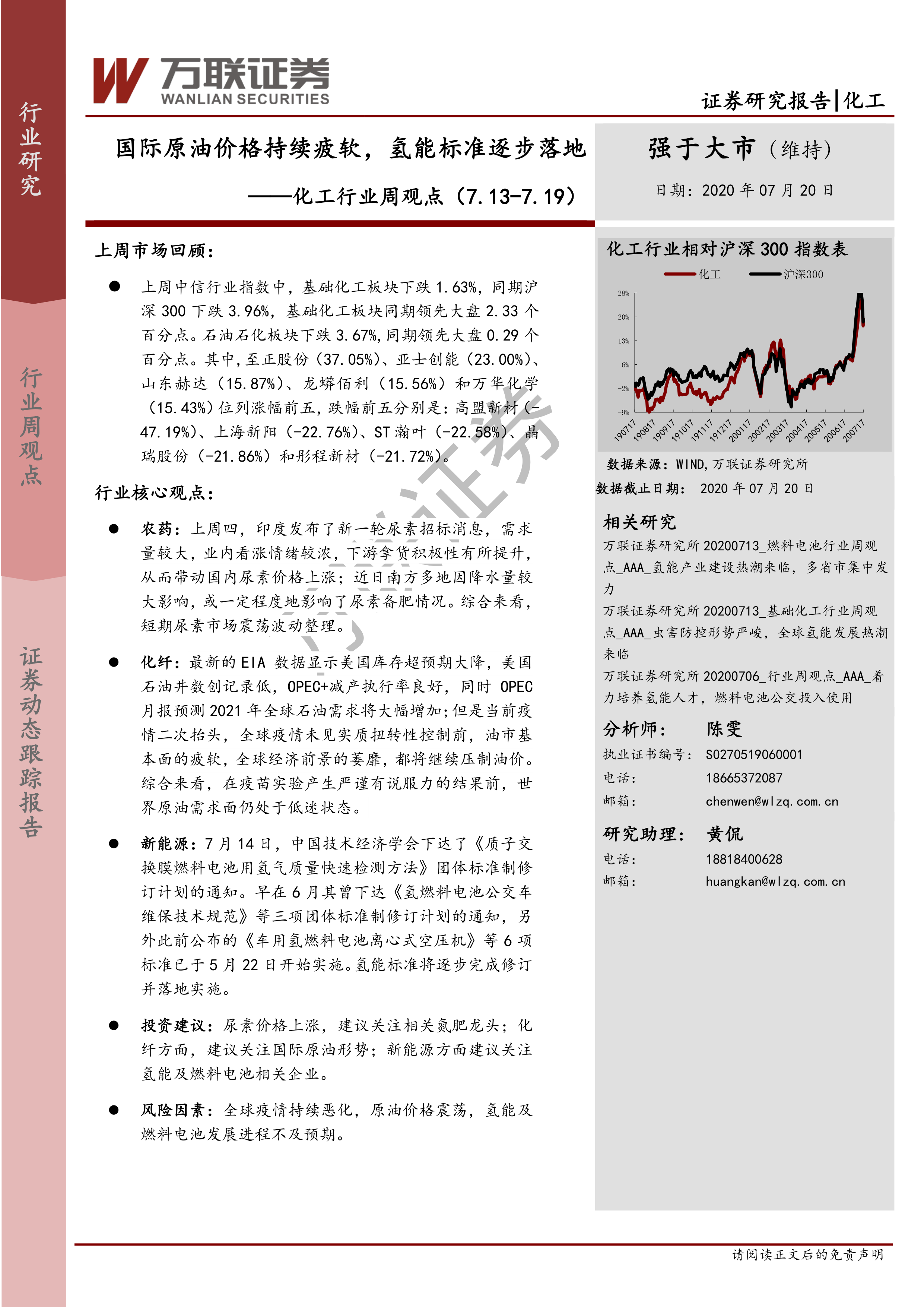 本报告基于万联证券研究所发布的化工行业周观点报告,利用统计数据和图表,对上周化工行业市场表现、主要化工产品价格波动、原油及天然气市场行情、以及氢能产业发展等方面进行了分析。报告指出,国际原油价格持续疲软对部分化工行业造成压力,但部分子行业表现强劲,例如氮肥行业受印度招标影响价格上涨。同时,氢能标准的逐步落地为新能源行业带来利好。报告最后提出投资建议,建议关注氮肥龙头企业、国际原油形势以及氢能和燃料电池相关企业,并提示了全球疫情持续恶化、原油价格震荡以及氢能及燃料电池发展进程不及预期等风险因素。 报告数据详实,分析客观,为投资者提供了有价值的参考信息。