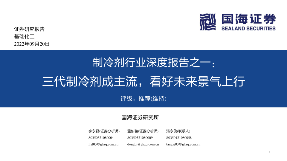 建议关注三代制冷剂生产企业:巨化股份、三美化工、东岳集团、永和股份、联创股份。综合考虑三代制冷剂未来的发展机会,维持基础化工行业“推荐”评级。