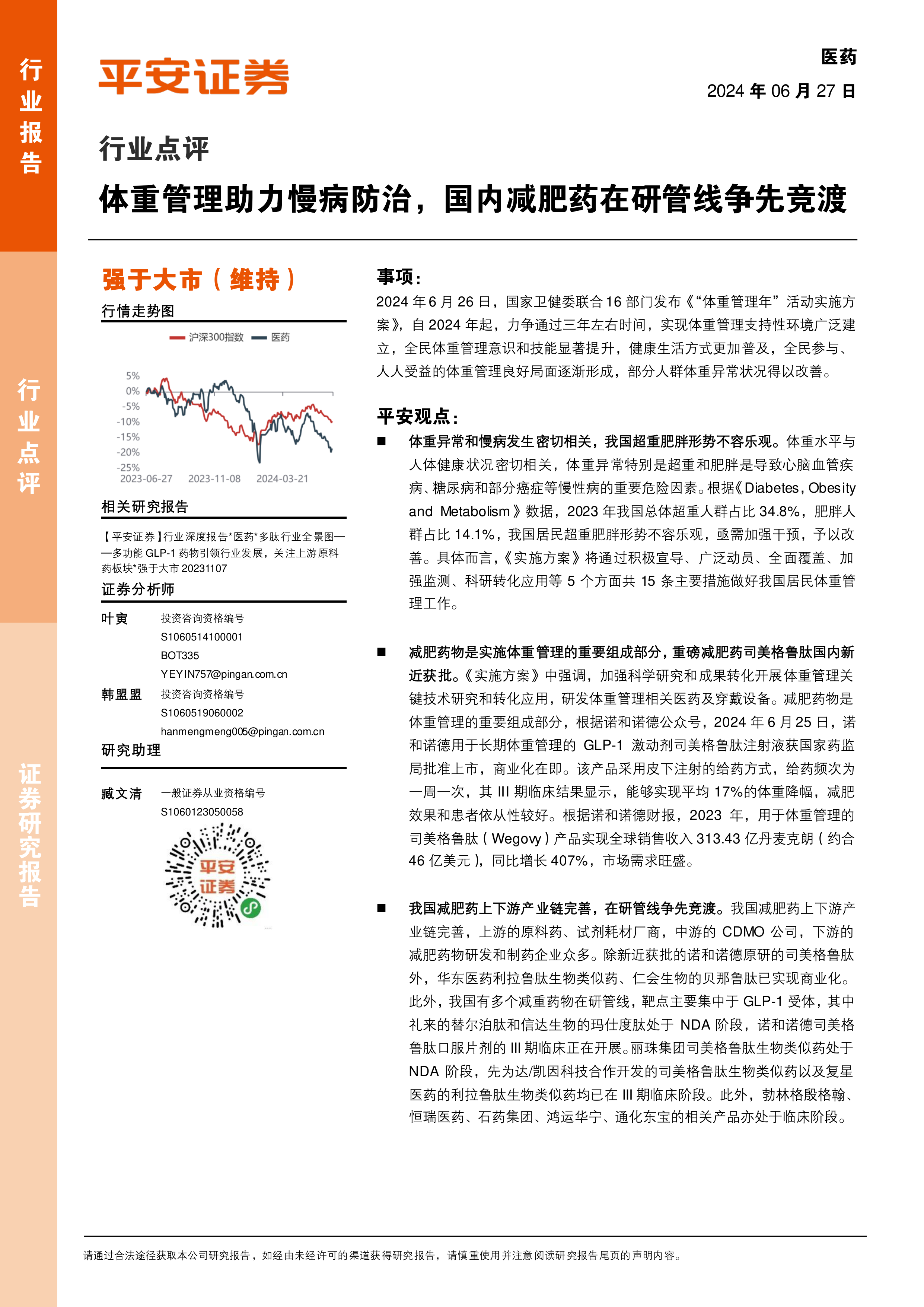 本报告的核心观点是:国家政策大力支持体重管理,为国内减肥药行业发展创造了有利条件,市场前景广阔。 具体而言,报告从以下几个方面阐述了这一观点: