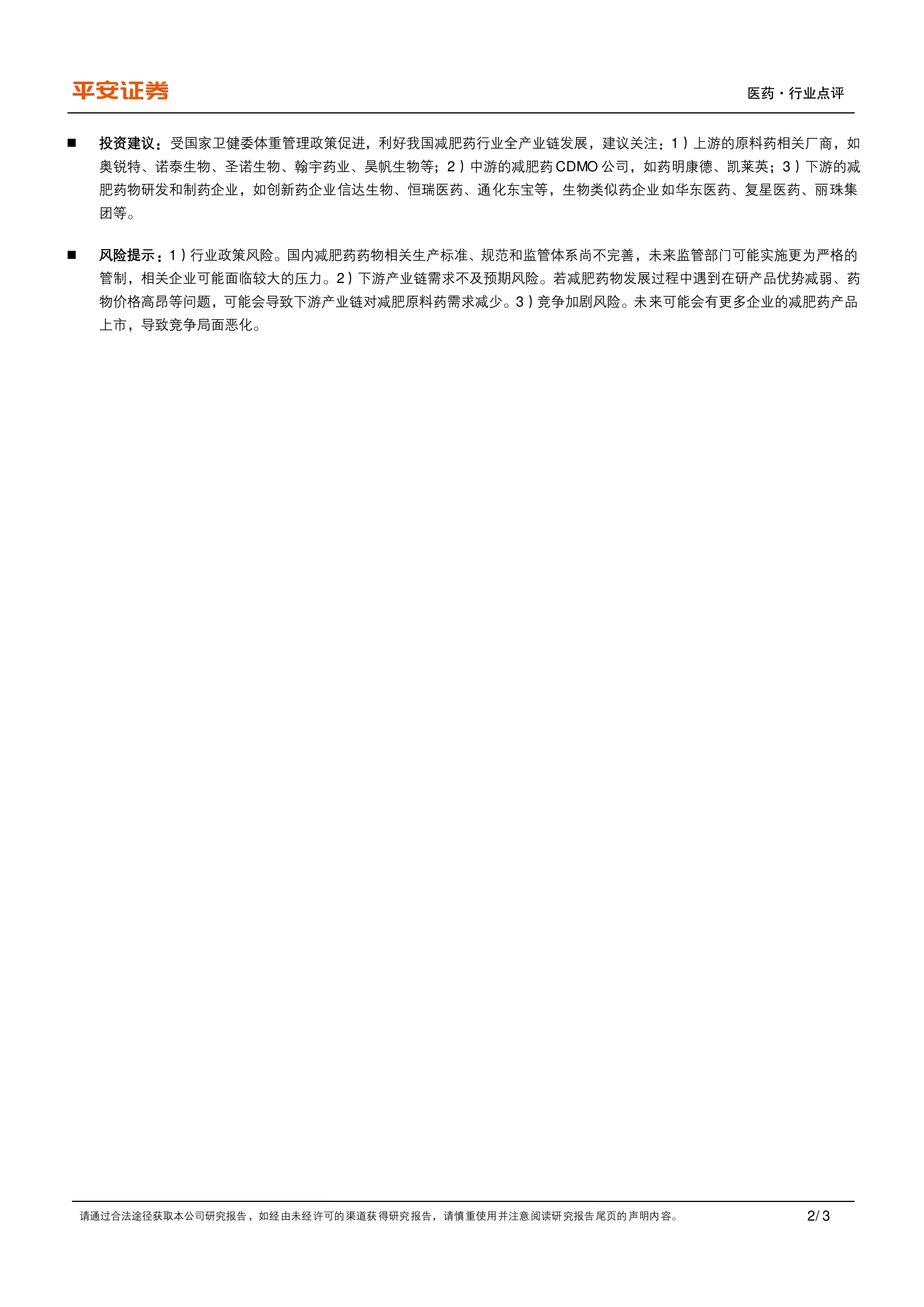 风险提示:1)行业政策风险。国内减肥药药物相关生产标准、规范和监管体系尚不完善,未来监管部门可能实施更为严格的管制,相关企业可能面临较大的压力。2)下游产业链需求不及预期风险。若减肥药物发展过程中遇到在研产品优势减弱、药物价格高昂等问题,可能会导致下游产业链对减肥原料药需求减少。3)竞争加剧风险。未来可能会有更多企业的减肥药产品上市,导致竞争局面恶化。